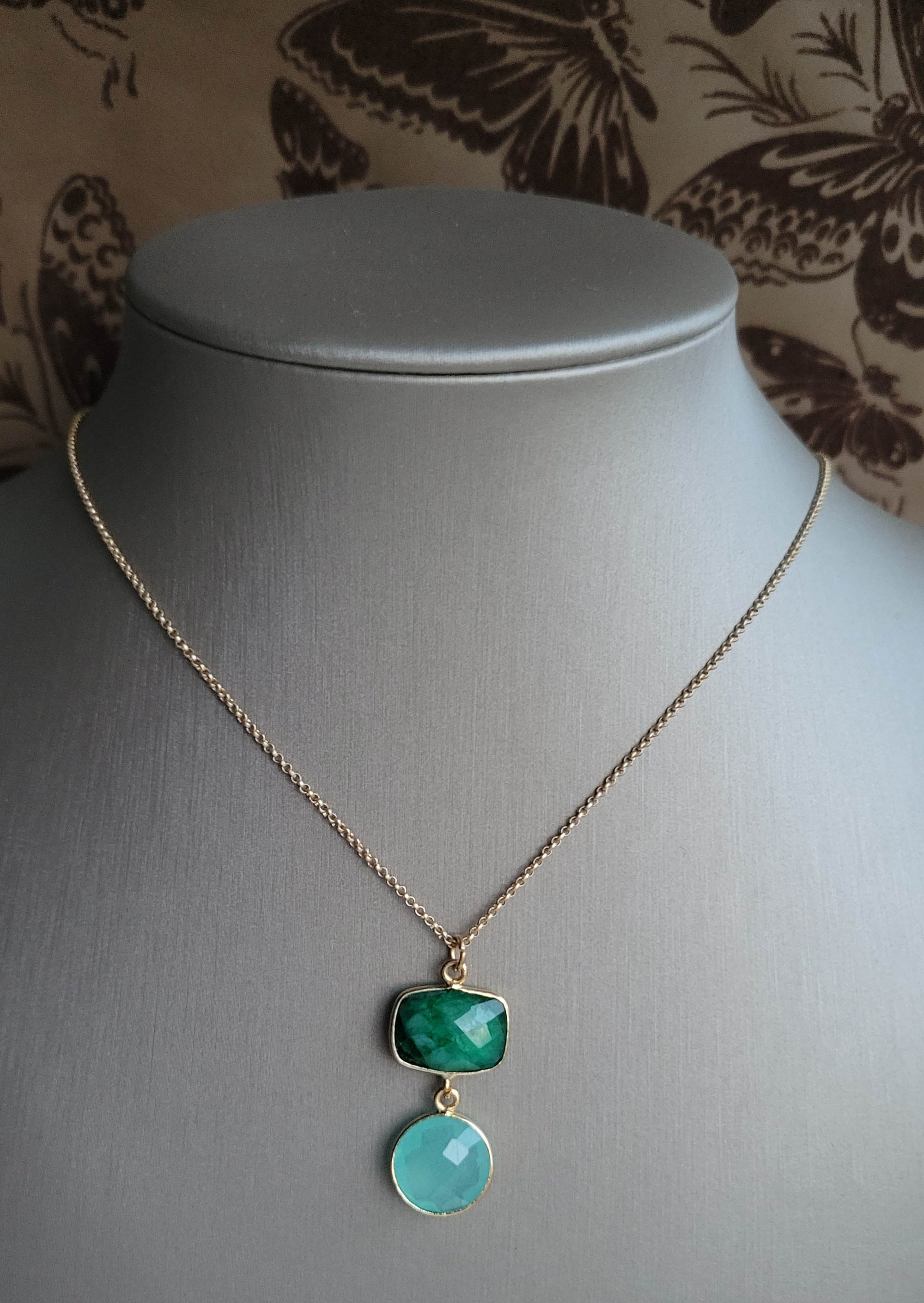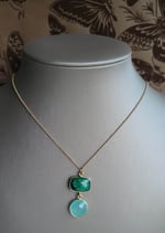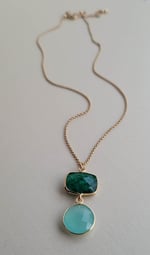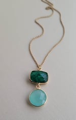 This colorful necklace will add an eye-catching pop to any outfit. The pendant is made from a earthy deep emerald green quartz paired with an aqua chalcedony; hanging from a fine gauge matte gold chain. An interesting color combination. Lovely.