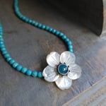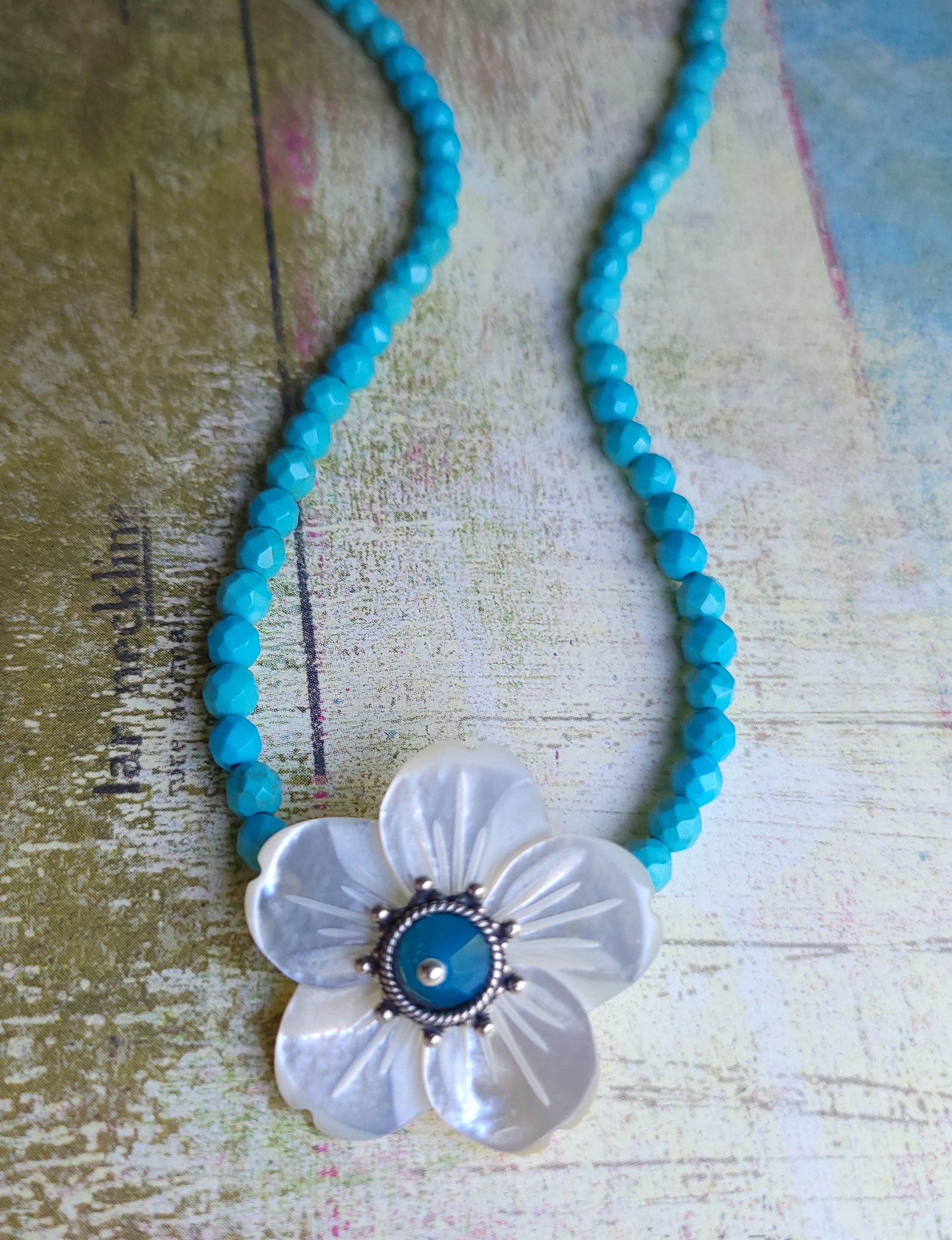 Pretty as a Spring Day - Carved Mother of Pearl Flower + Faceted Turquoise Necklace