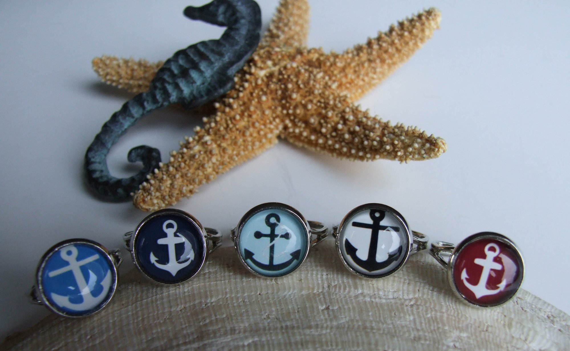 Classic nautical ring. White anchors on a navy background captured beneath a glass cabochon. 12mm cabochons (just under ½-inch). Lovely substantial sterling silver setting. Beautifully detailed bezel.