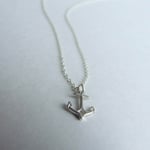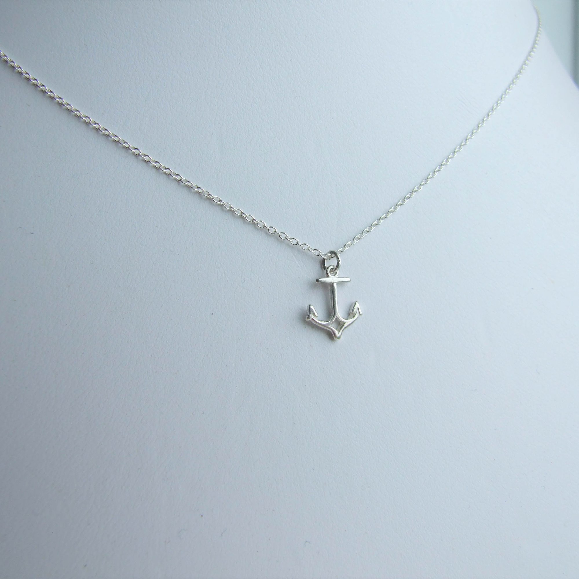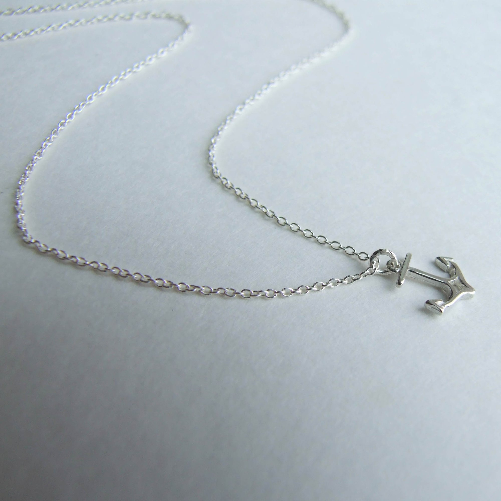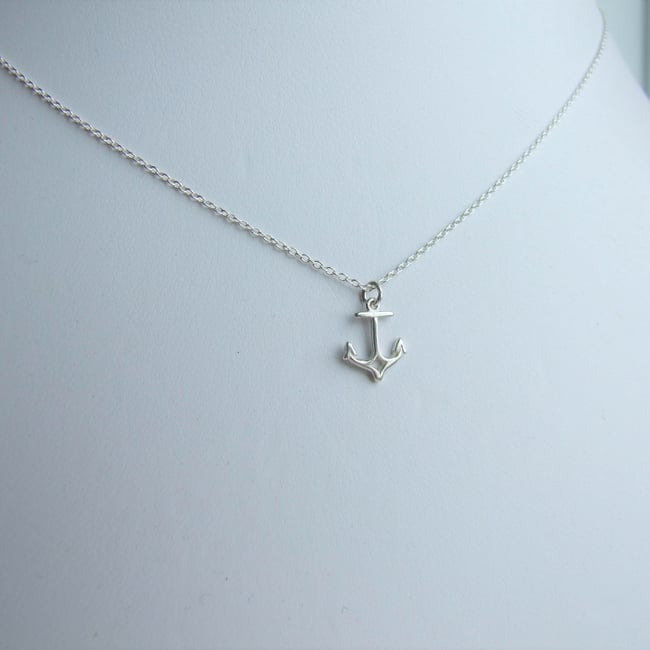 A dainty sterling anchor (11mm) hangs from a fine sterling silver chain. Finished with a sterling spring clasp. Length is 16".