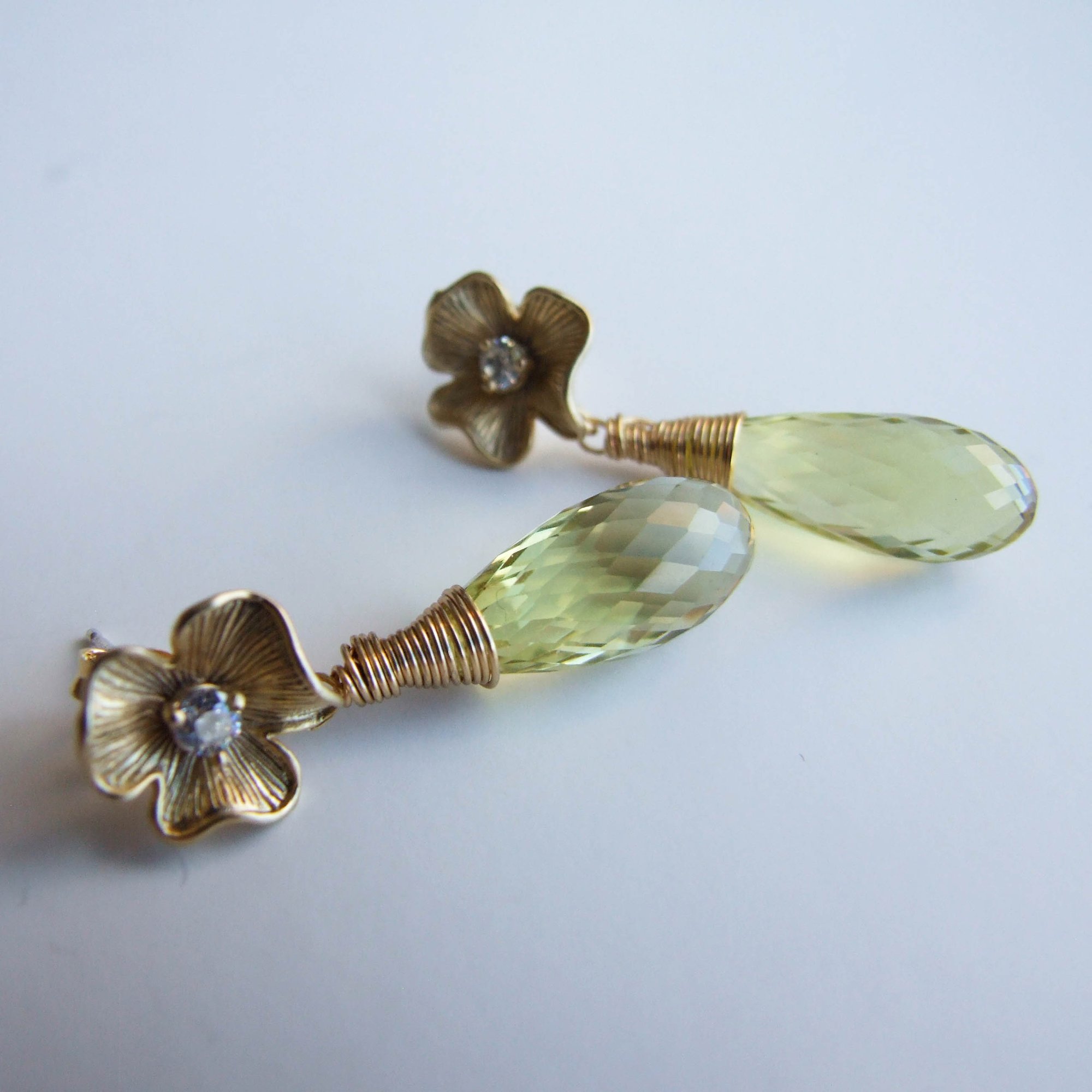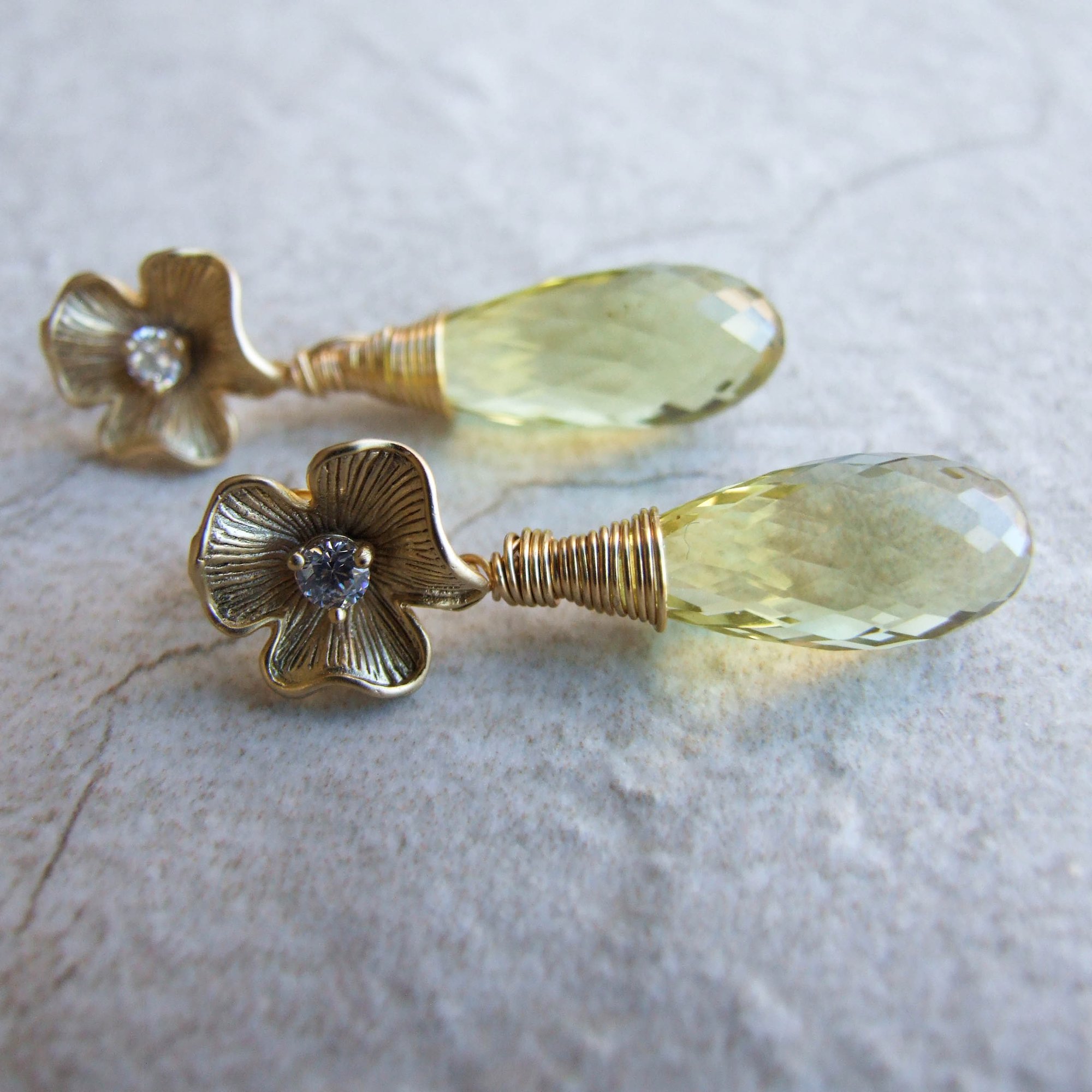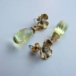Big, bold, beautiful micro-faceted lemon quartz teardrops dangle from lovely cubic zirconia encrusted floral stud earrings. Sterling posts. Perfect for your special occasion.