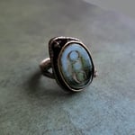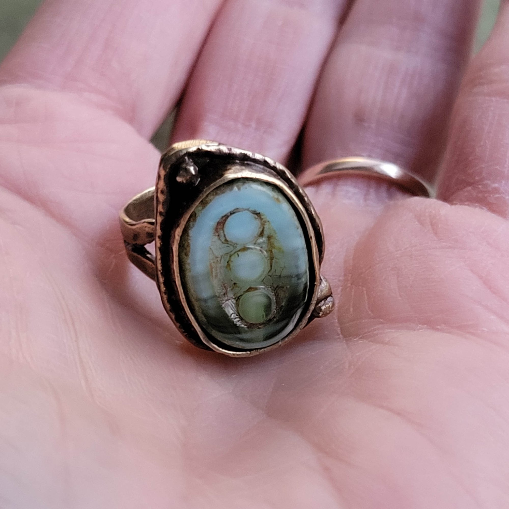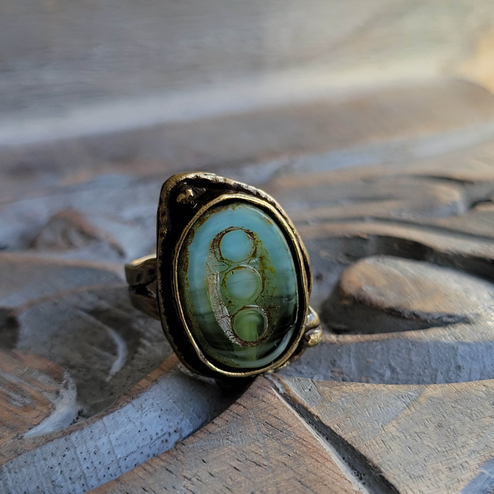 An earthy mossy green and milky opal Czech glass bead is nestled in a lovely bronze one-size-fits-most ring. Even prettier in person! An impressive statement ring. Earthy and bohemian.