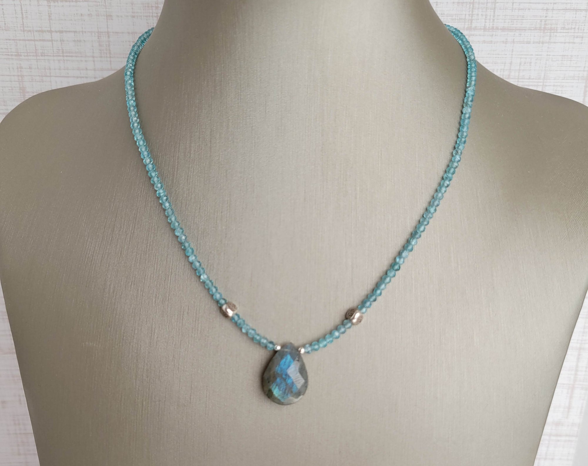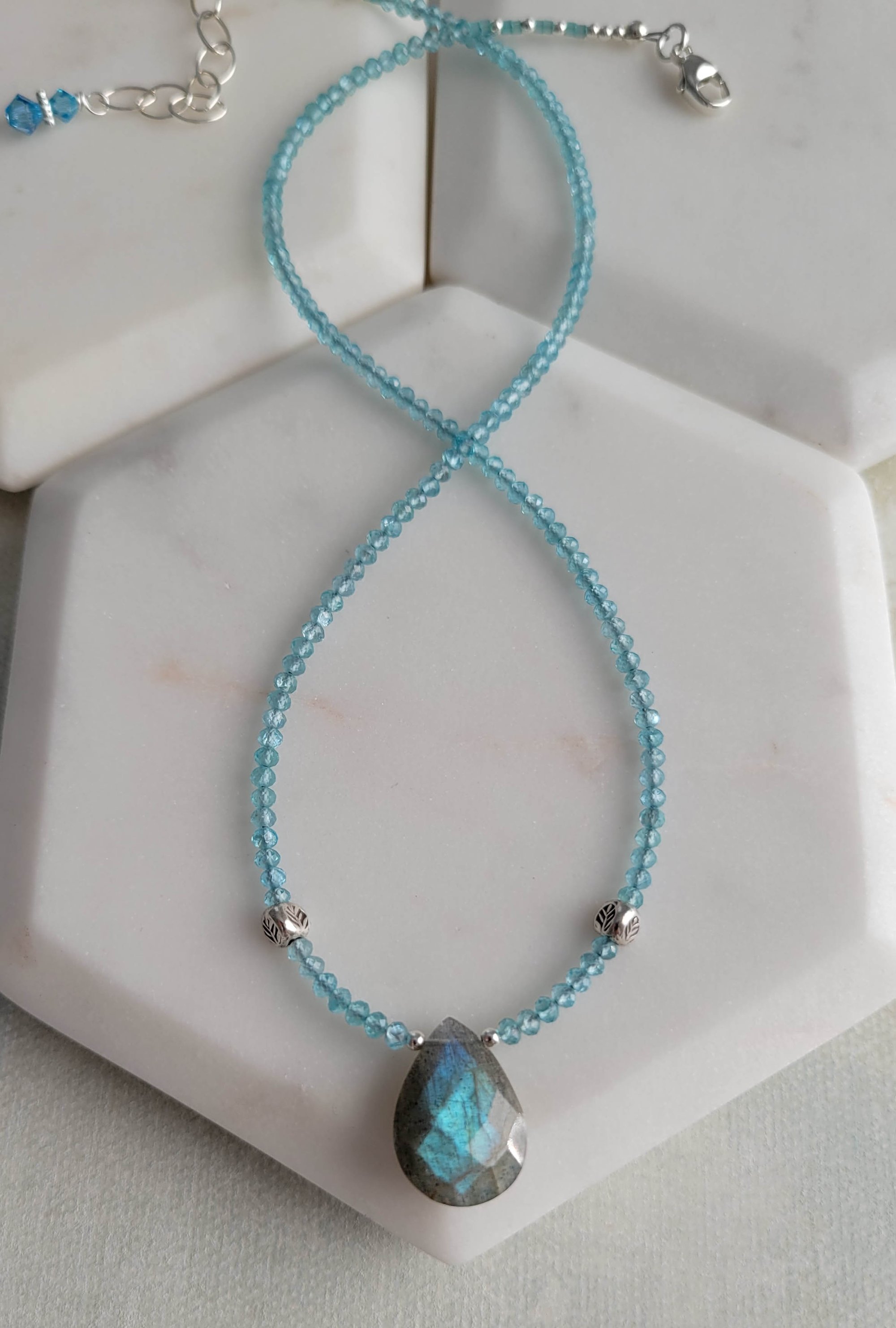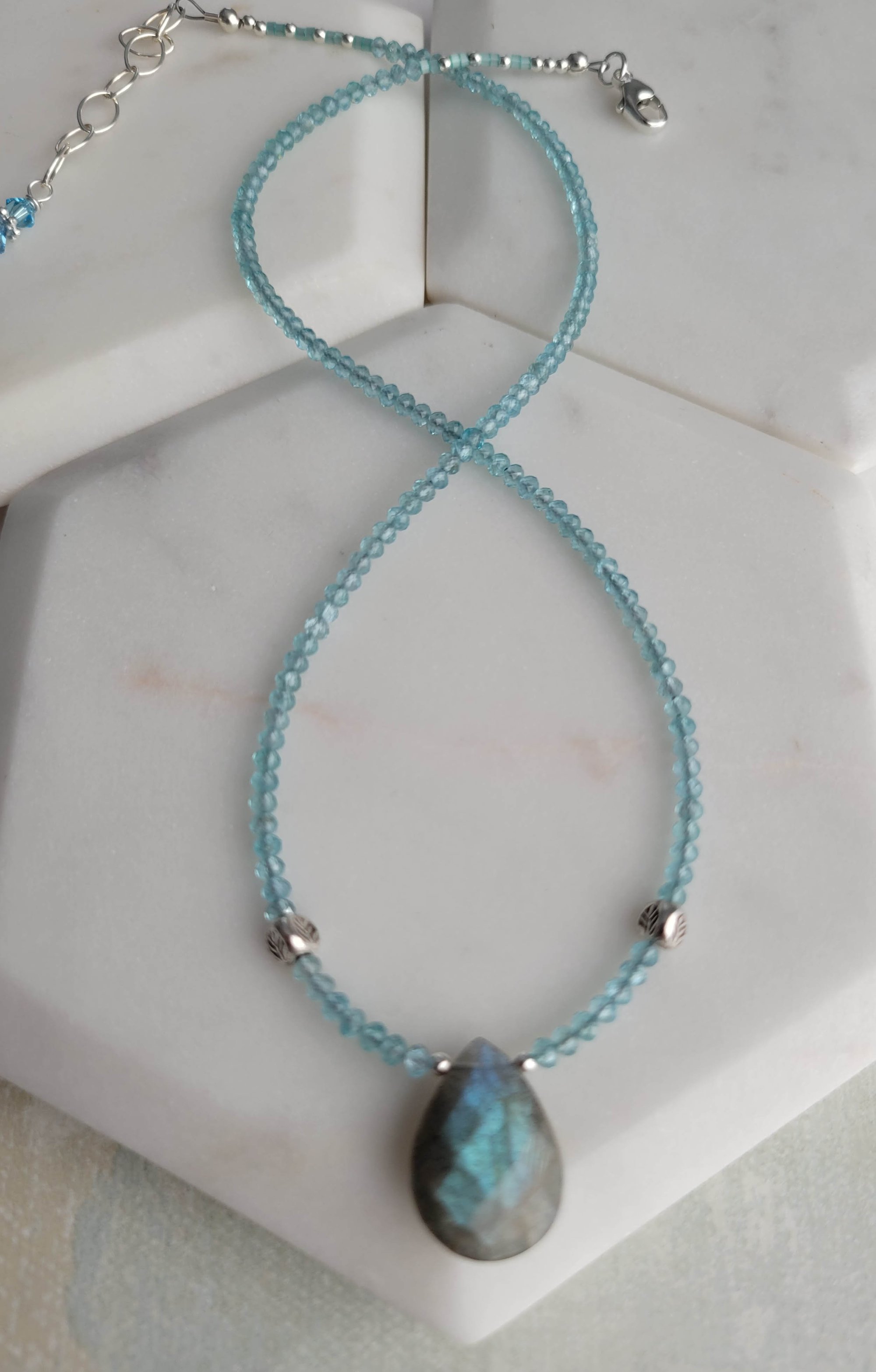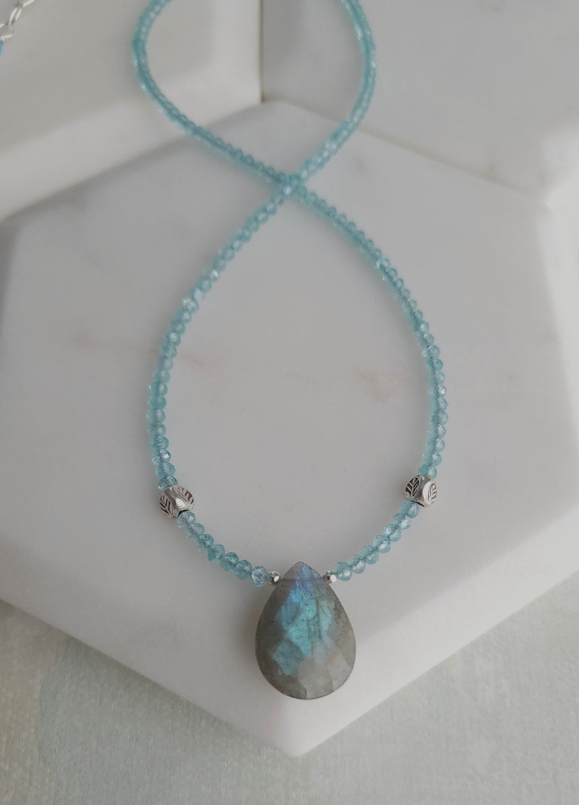 A pretty blue flash labradorite teardrop pendant hangs from a strand of tiny (3mm) faceted bright aqua apatite beads dotted with two leaf-stamped sterling silver beads. This simple necklace is lovely alone or can be layered with other necklaces.