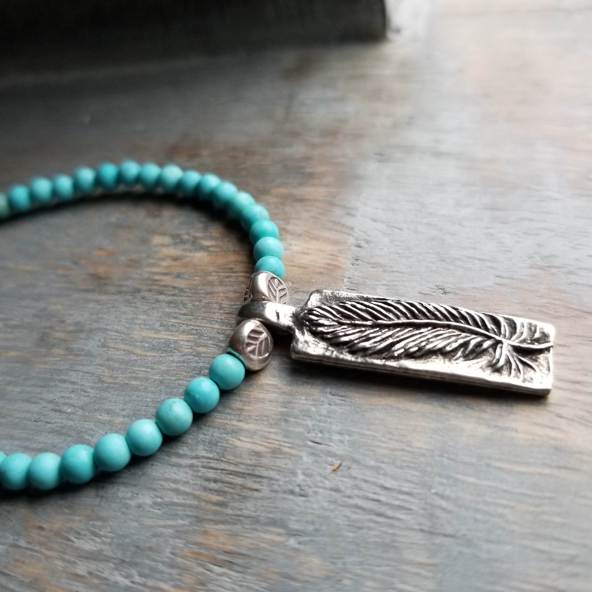 This necklace makes a strong statement about the symbolism of the feather. The feather is a powerful symbol representing trust, honor, strength, and wisdom. The handmade pewter pendant (from Green Girls) hangs from a pretty necklace of small (4mm) light blue turquoise beads. The inscription on the back of the pendant reads: To Thine Own Self Be True. Finished with a sterling silver lobster clasp.