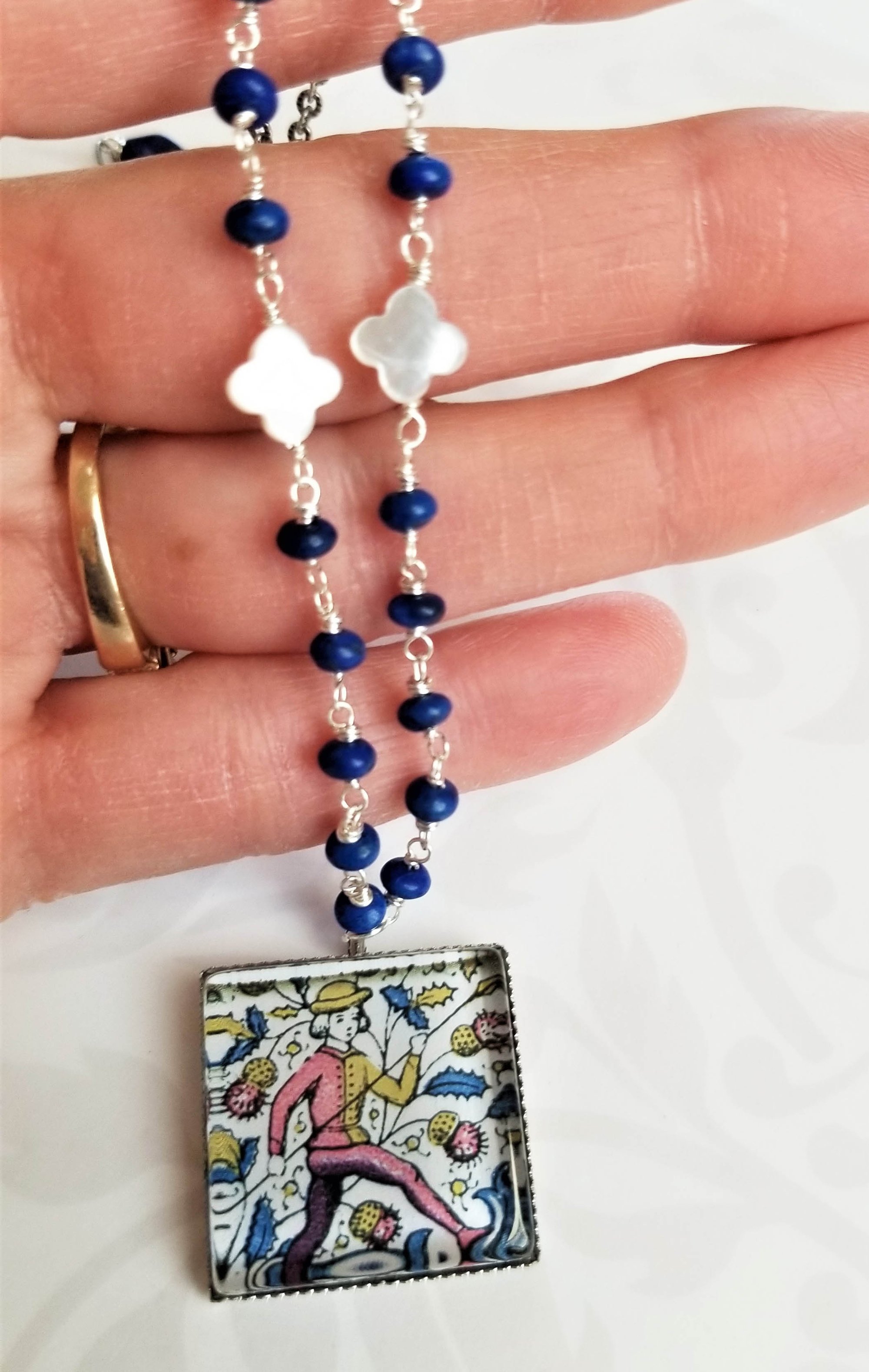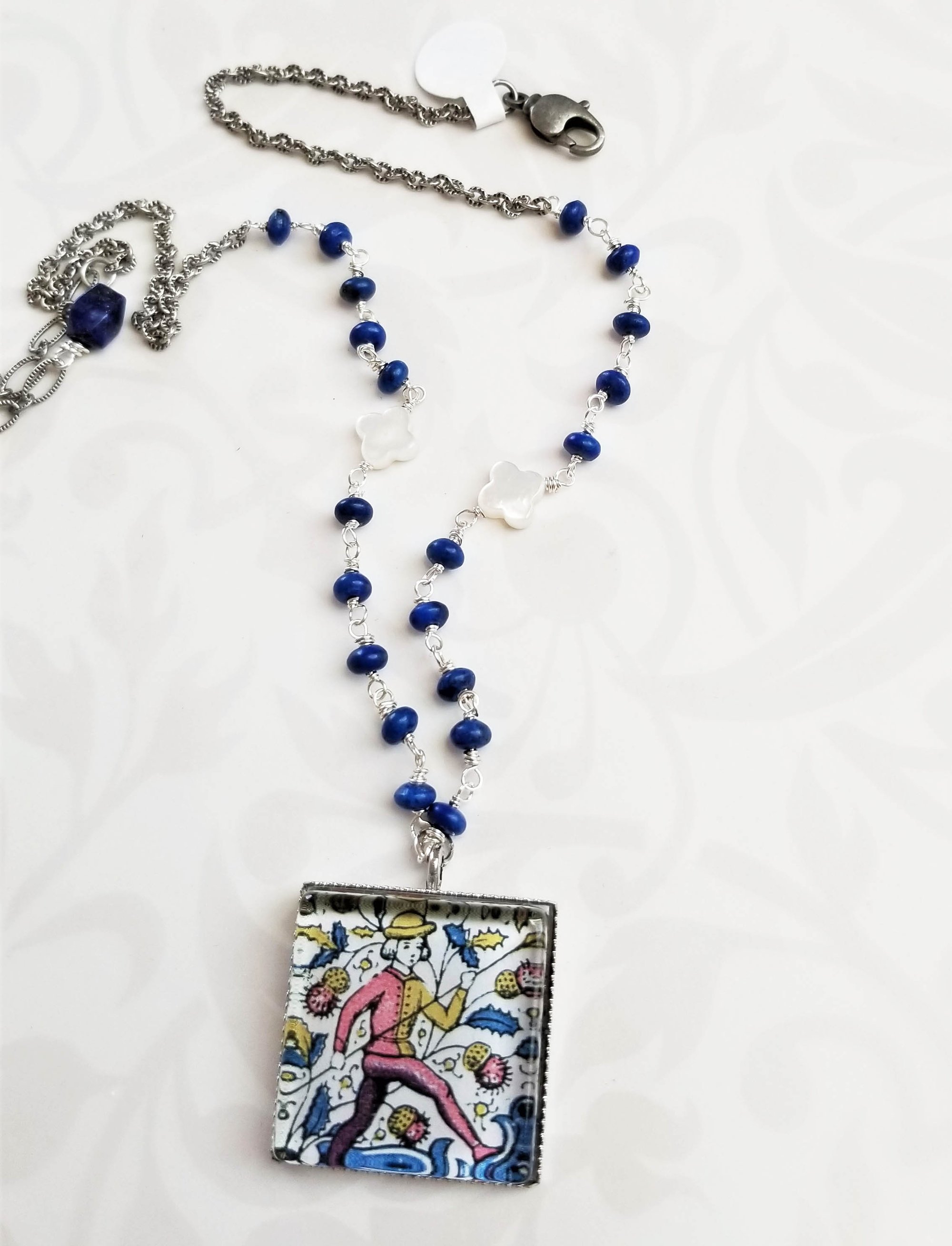 An interesting and colorful handmade folk art pendant is hanging from a handmade chain made from lapis beads and mother of pearl clovers – each bead individually hand-wrapped for a unique look. All handmade components are made by me. An additional length of lovely lightly oxidized textured link chain. Pendant is 1” square. Finished with an oxidized silver lobster clasp.