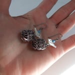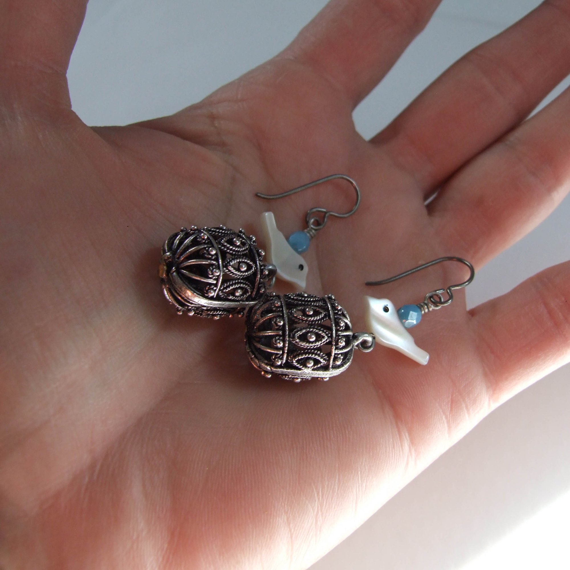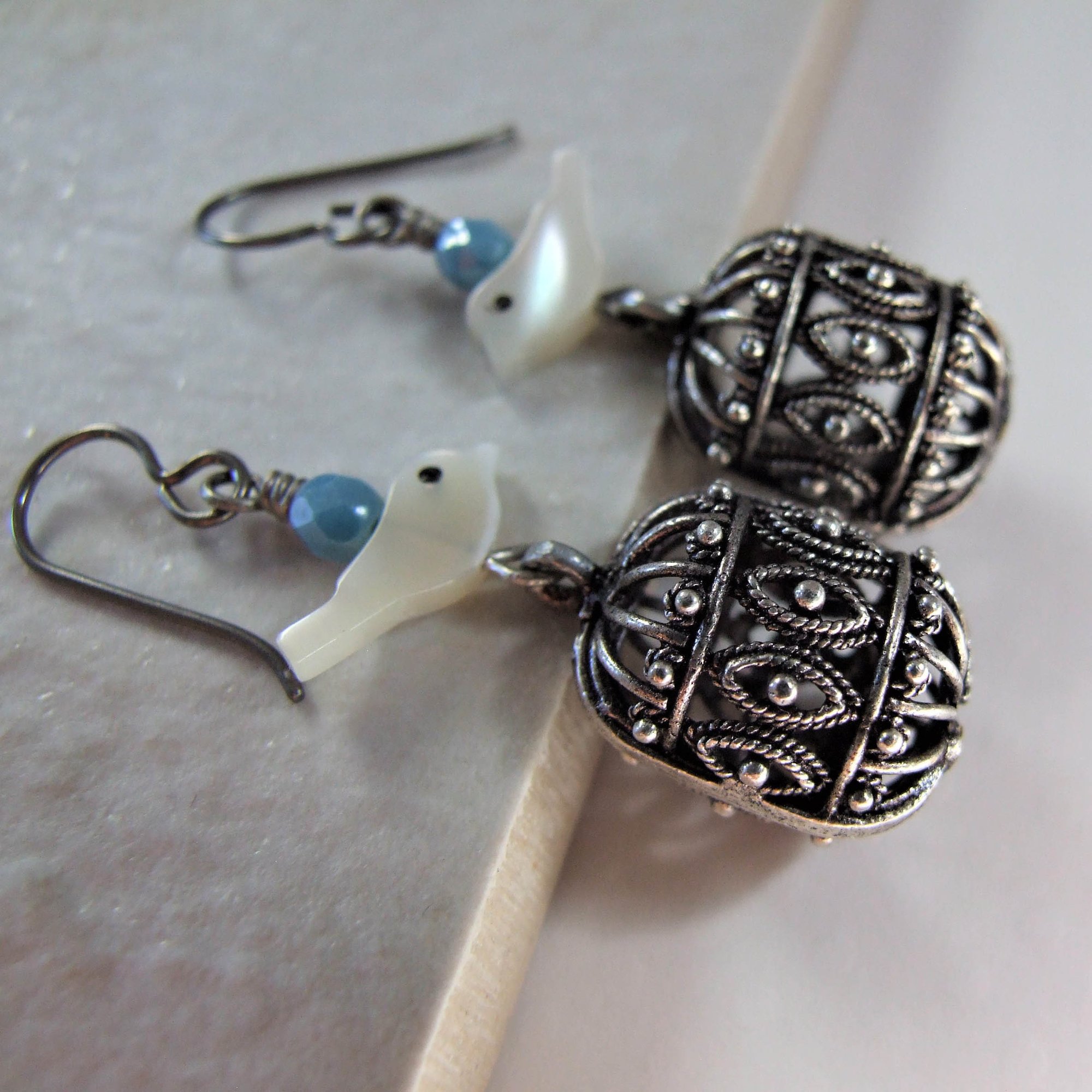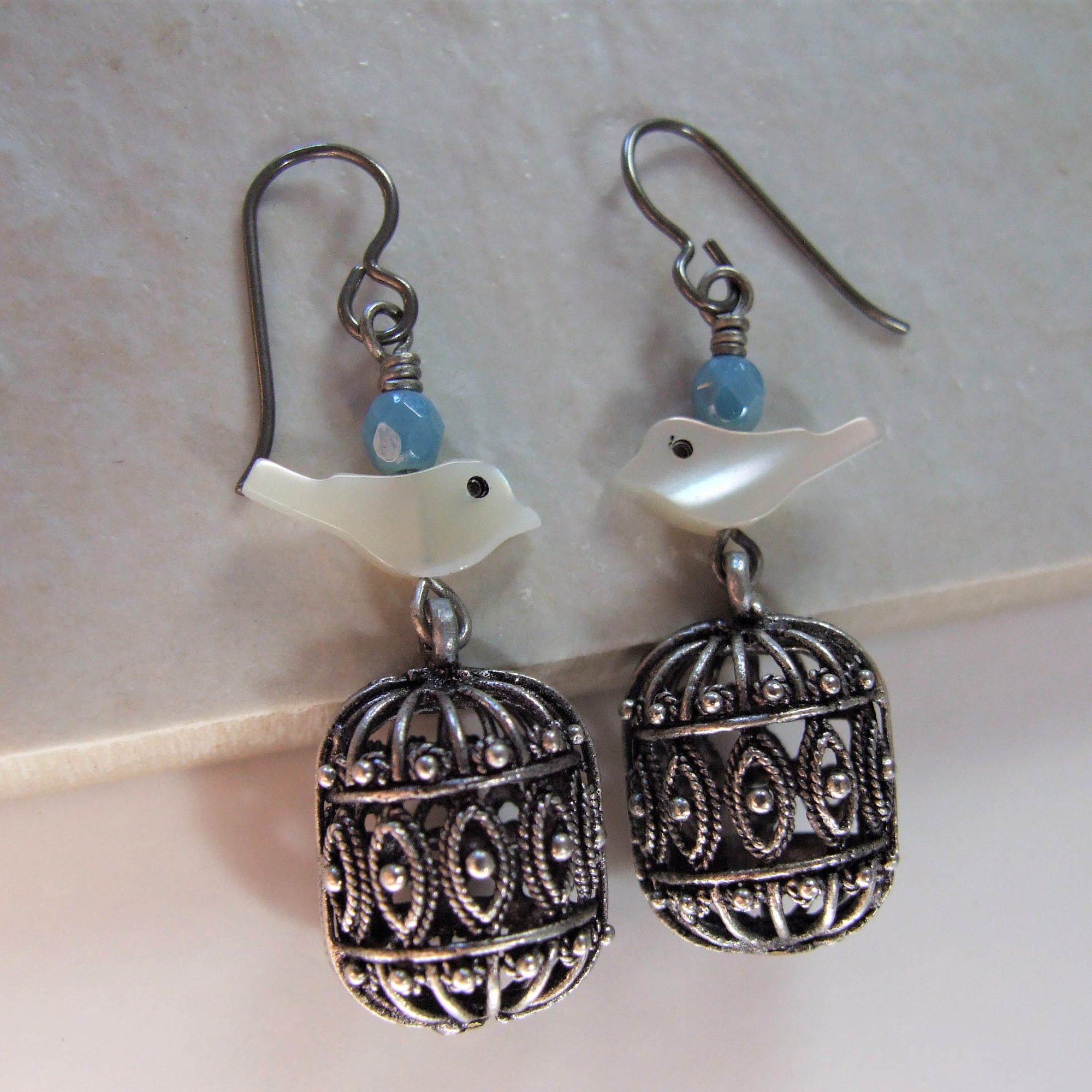 A bevy of whimsy. White mother of pearl birds sit freely atop a silver cage. Hanging from sterling silver ear wires. You'll love having these fine feathered friends on board for the ride.