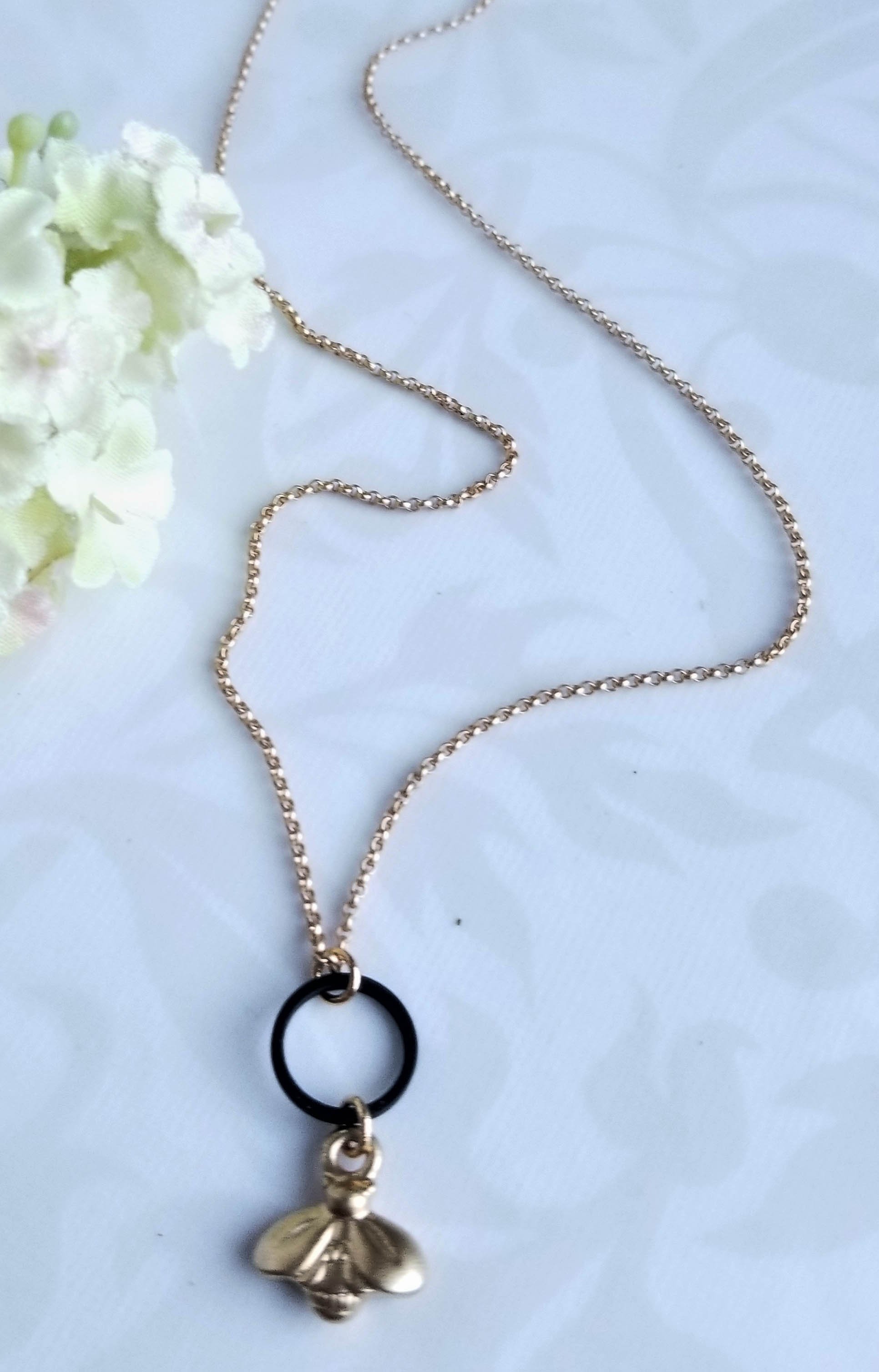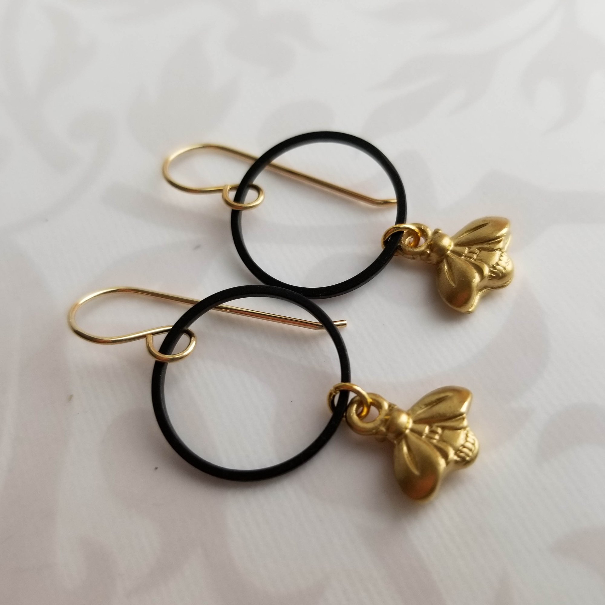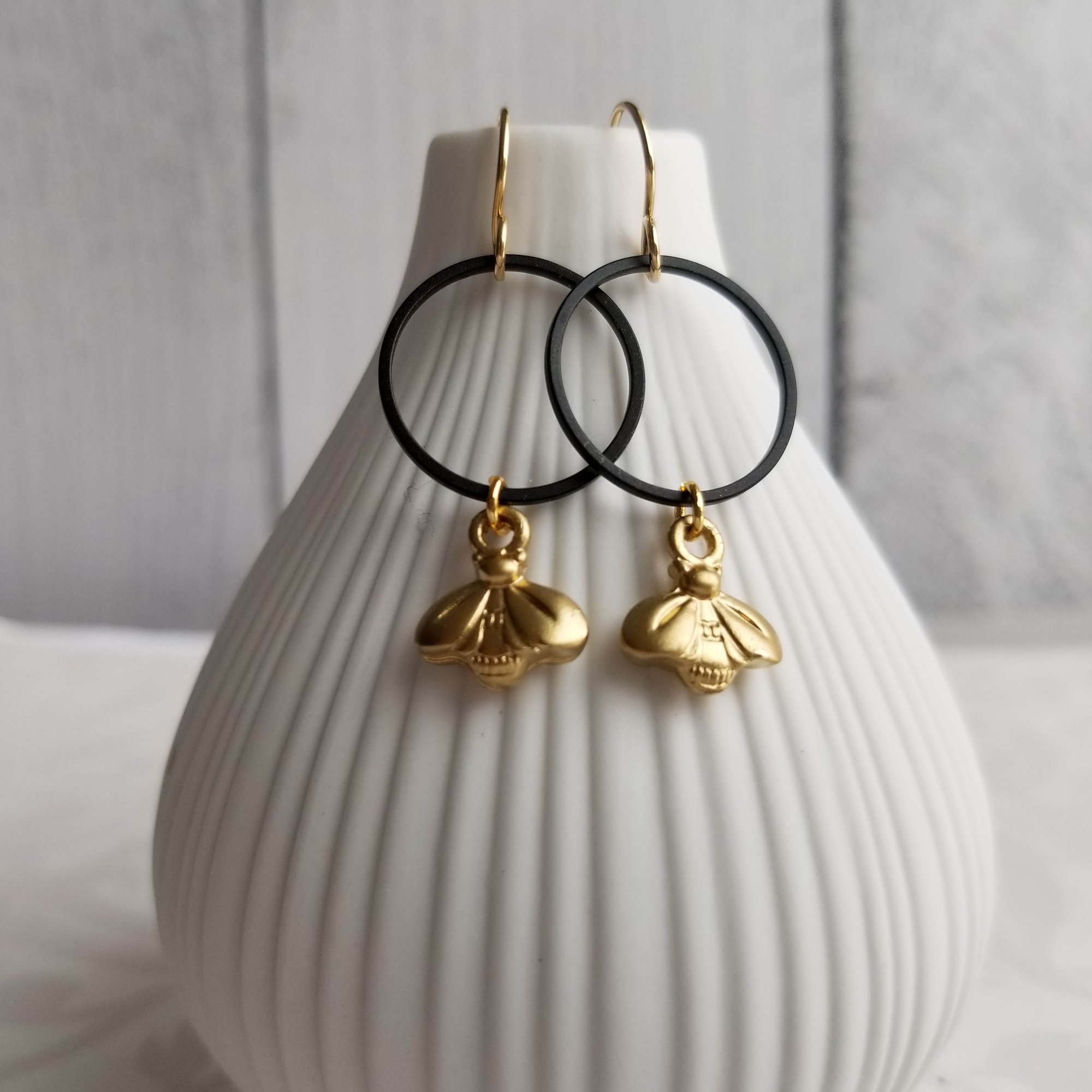Matte gold honey bees hang from matte black circles. Hanging from gold-filled ear wires. Circles measure 15mm (3/4").