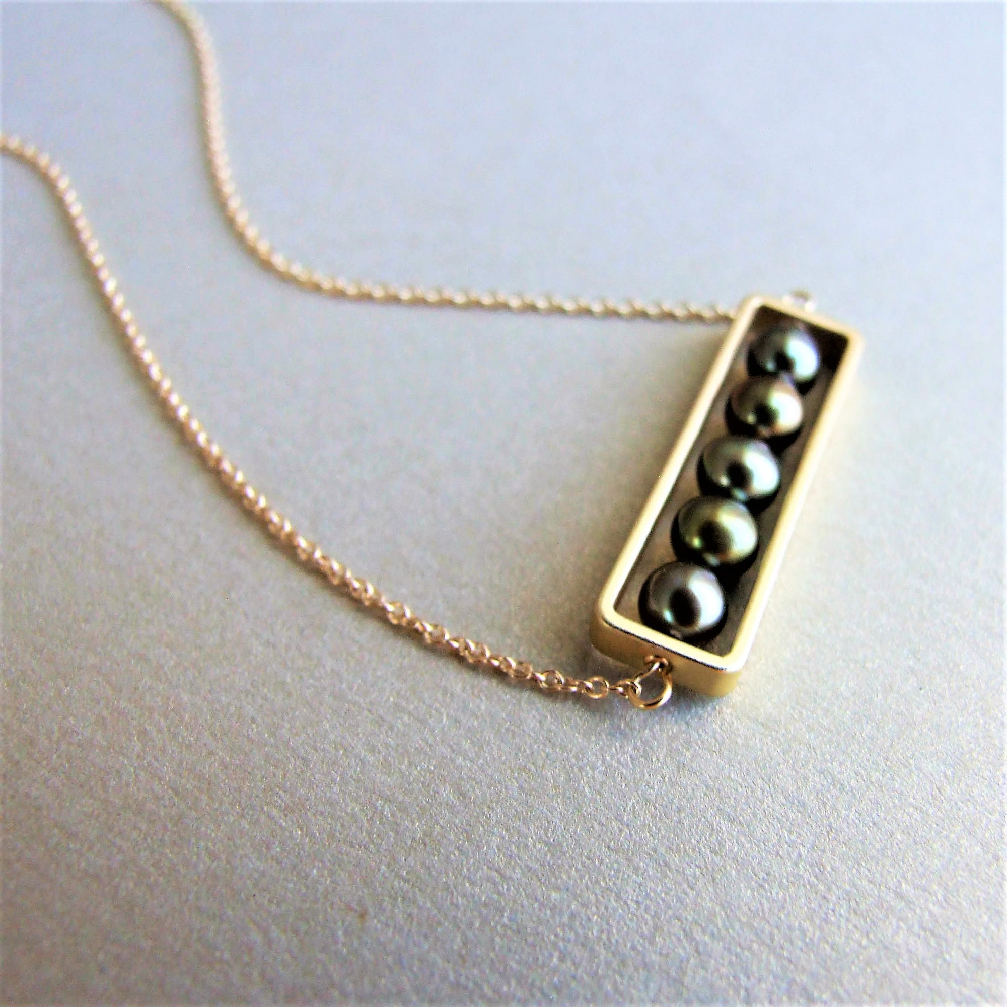 Beautifully sophisticated. Olive colored freshwater pearls shimmer with golden highlights within this matte gold frame to form an abacus pendant. Ultra slim matte gold chain. A soft whisper of a necklace.