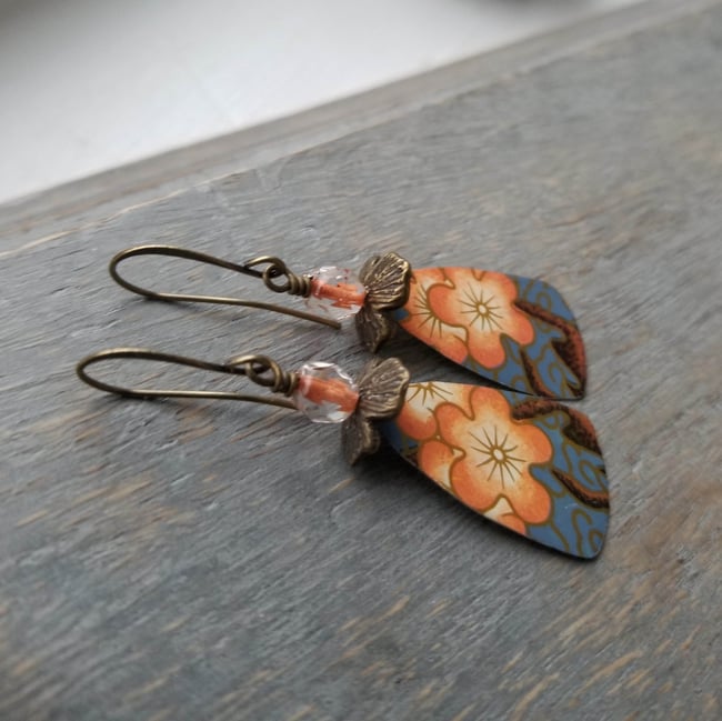 Hand-cut from a vintage tea tin, these earrings have been made to resemble porcelain pottery-shards. Topped with brass tropical leaf caps and orange lined glass beads. Hanging from antique brass ear wires (naturally lead and nickel free). Aloha - they're sweet.