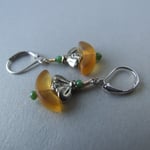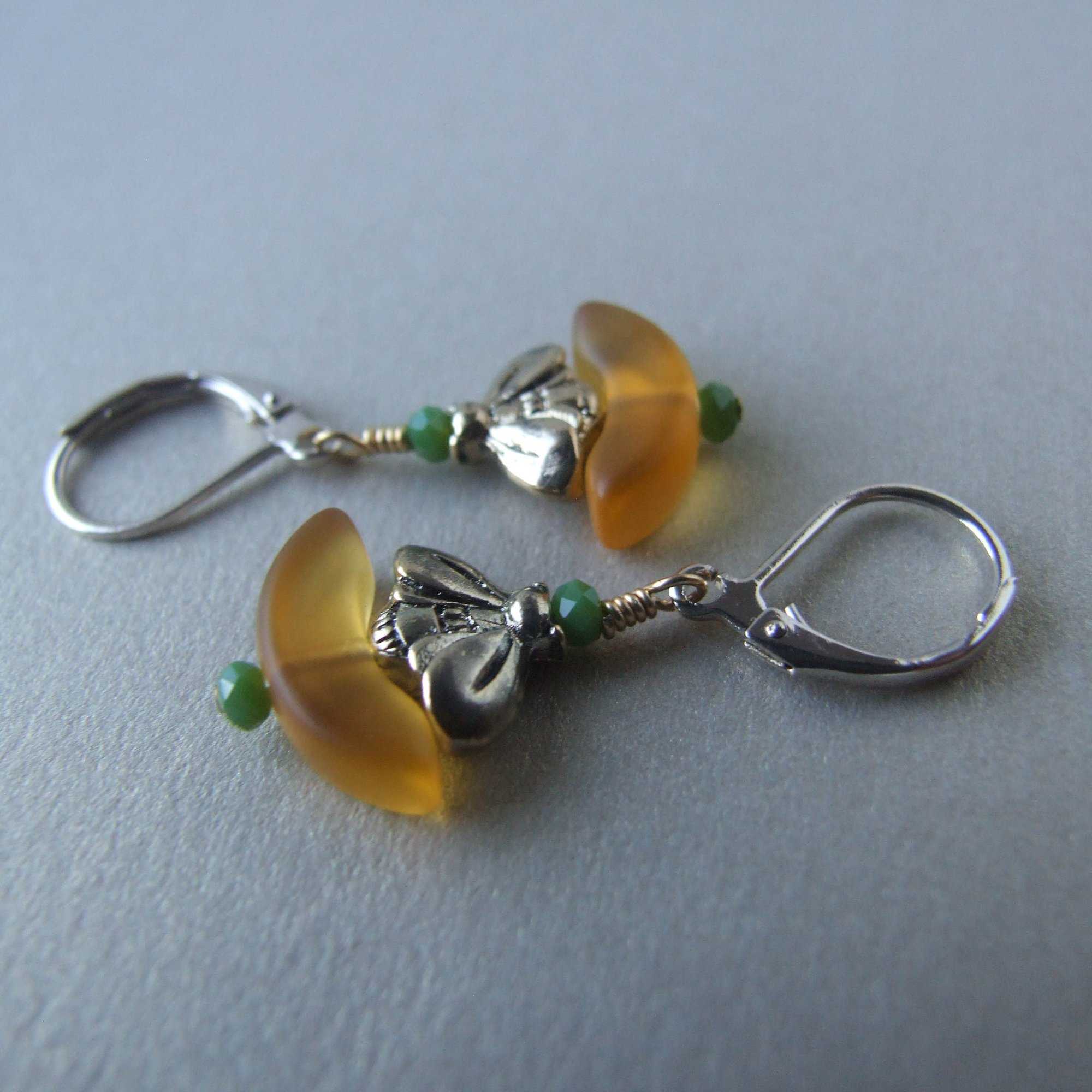 Lovely vintage gold + silver honeybees sit on a honey gold glass. Accented by green faceted Czech glass. Brass (naturally lead and nickel free) or sterling silver lever back ear wires.