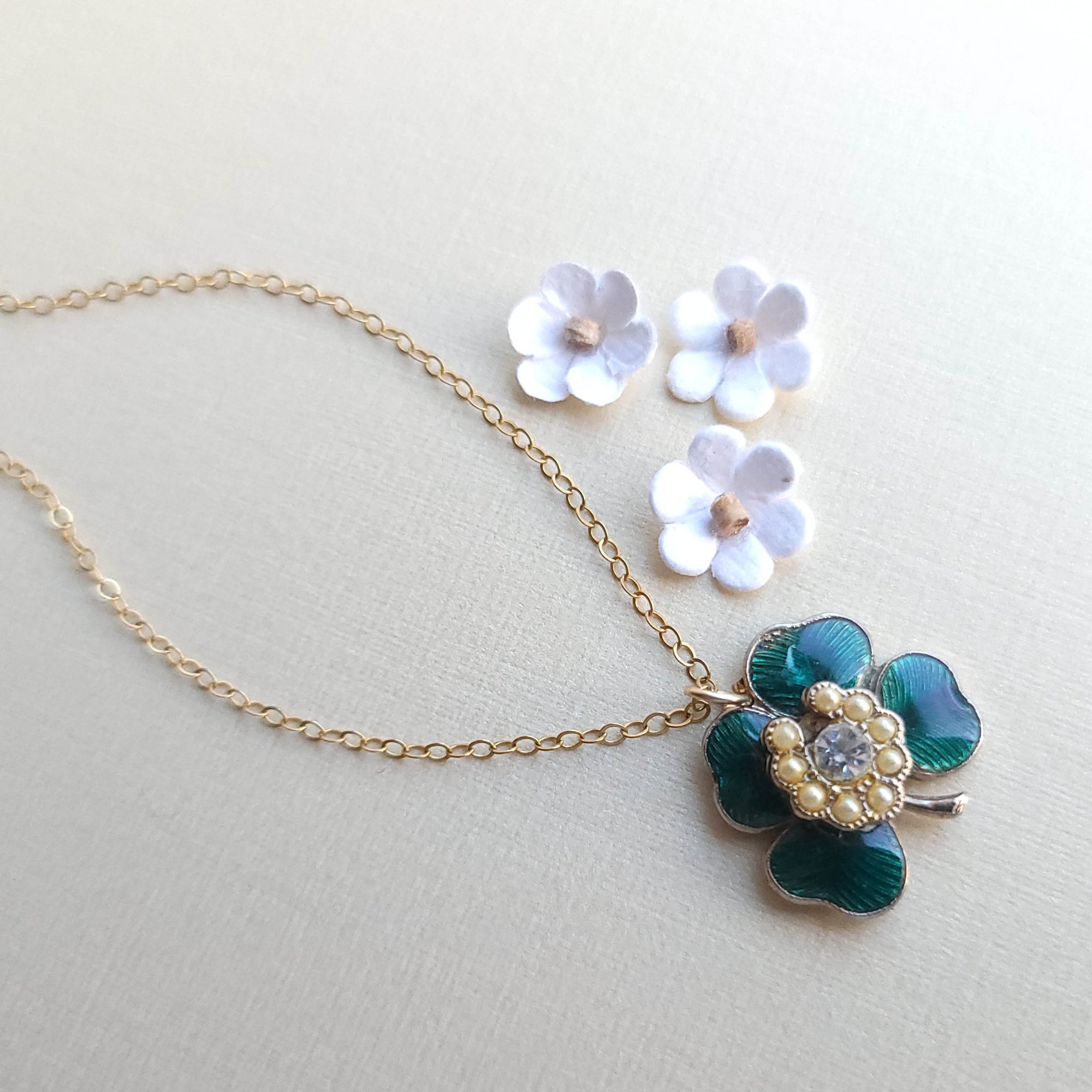 A repurposed vintage enameled shamrock earring is the focal of this sweet little necklace. Accented with a tiny faux pearl horseshoe (for luck!) and a shiny rhinestone. All hanging on a fine-gauge gold filled chain. Length is 15-1/2" - 17-1/2".
