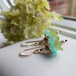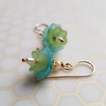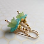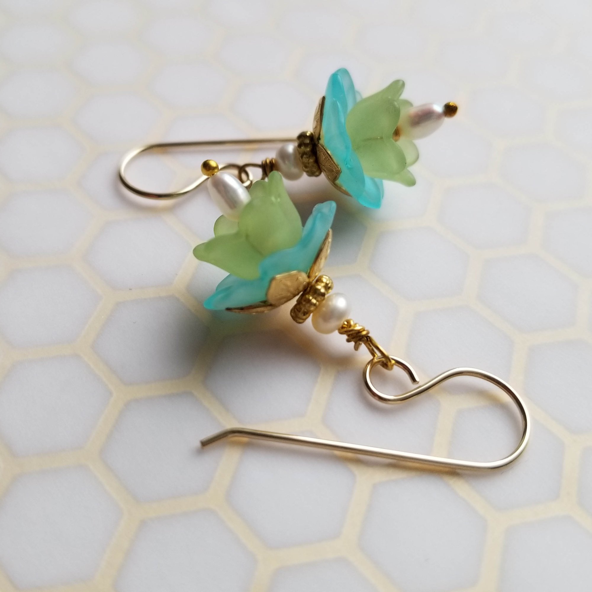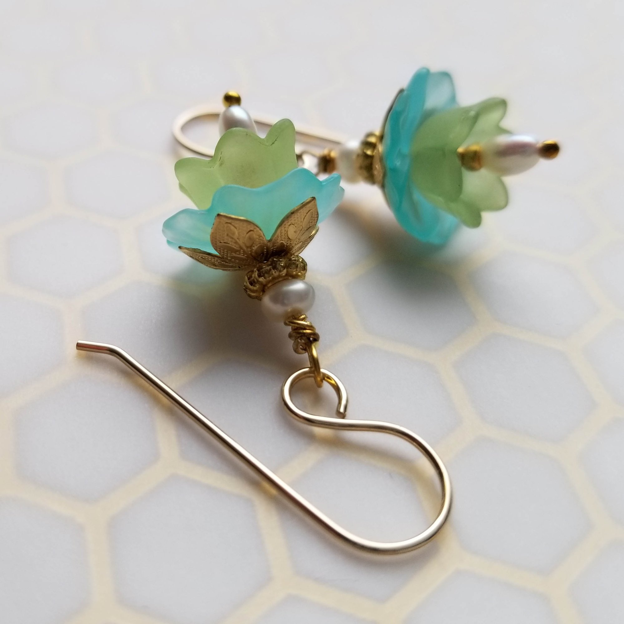 Lovely as an summer breeze. Vintage lucite in aqua and green shelter a tiny teardrop freshwater pearl inside. Topped with shiny brass caps and tiny freshwater pearl rondelles. Hanging from gold filled ear wires. Length is 1-1/4” from the top of the ear wire to the bottom of the teardrop pearl.