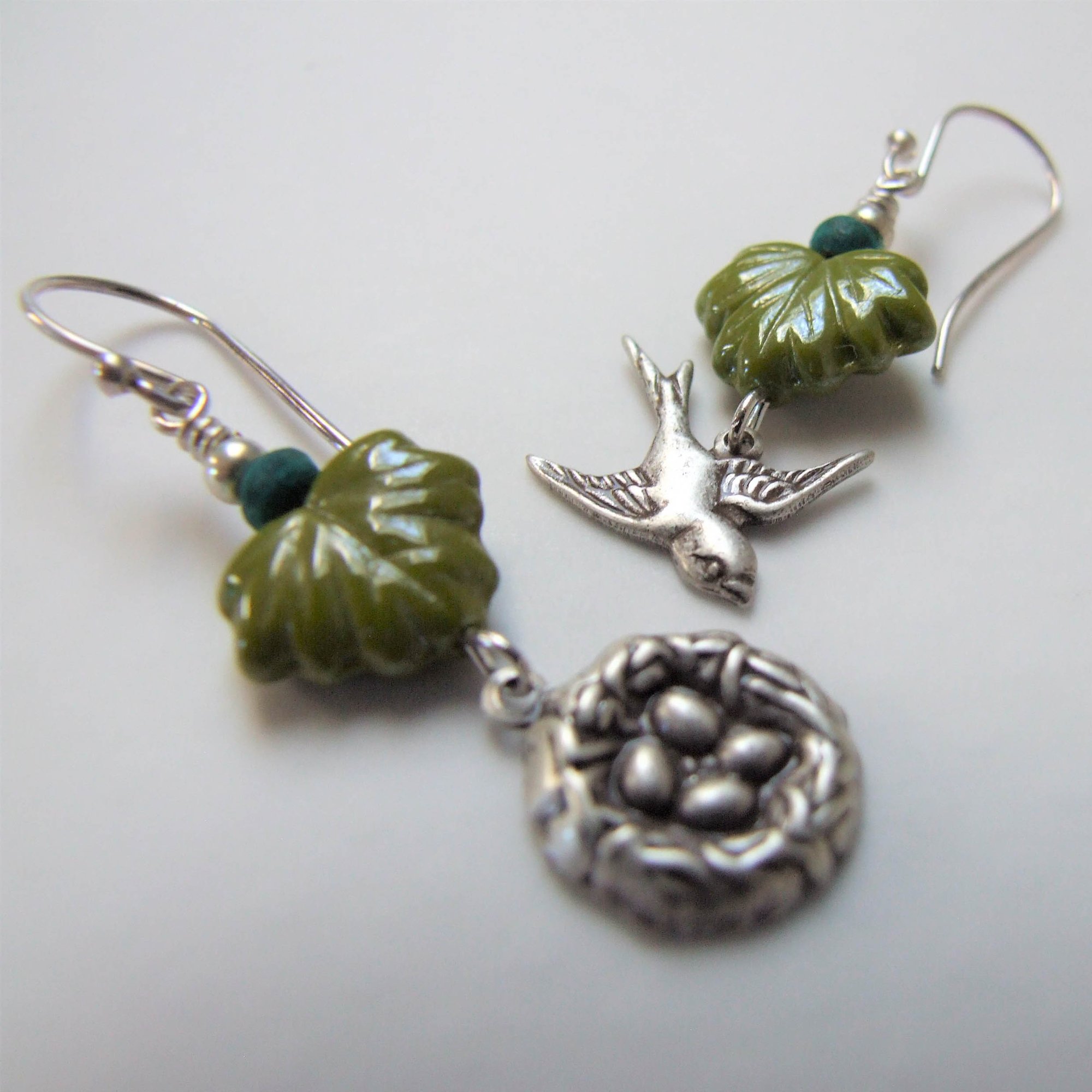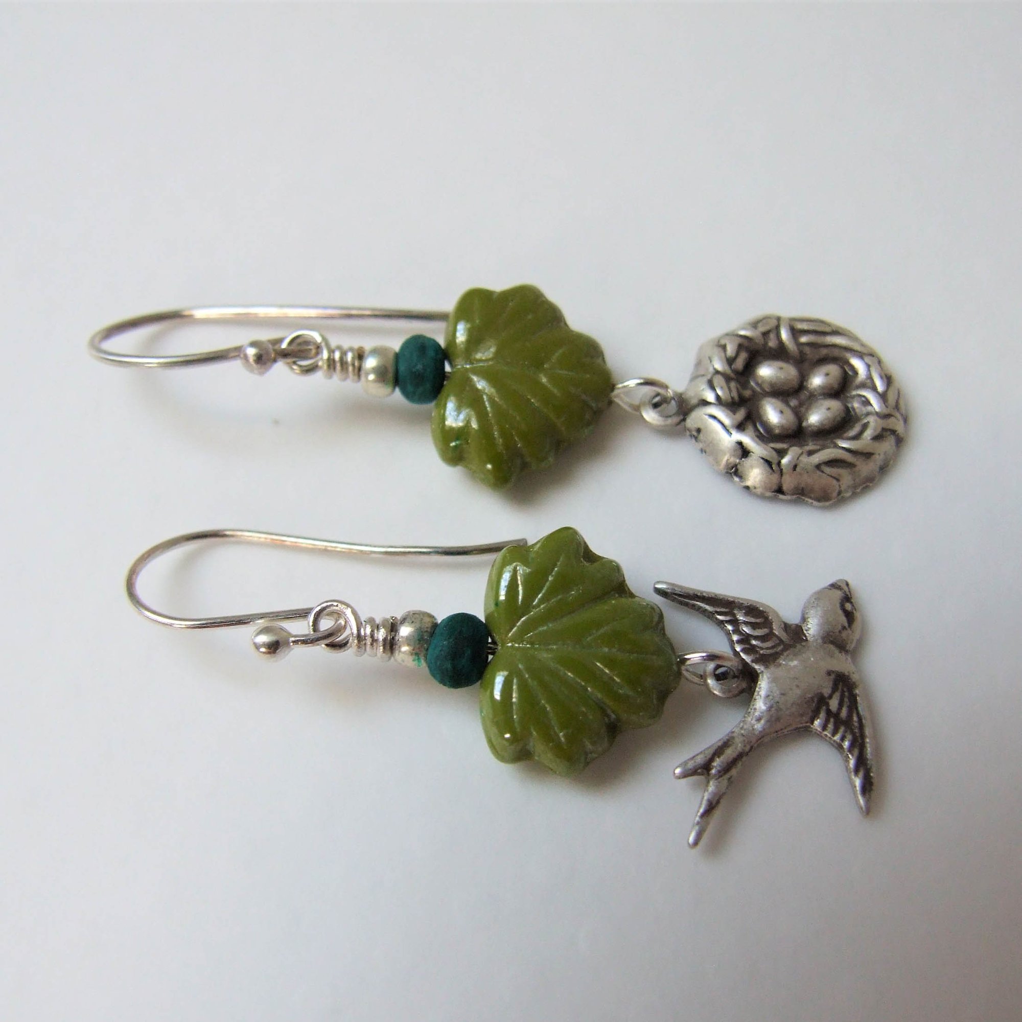 A happy swallow and her nest are nestled among bright green grape leaves. Hanging from sterling silver ear wires.