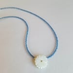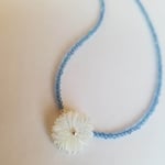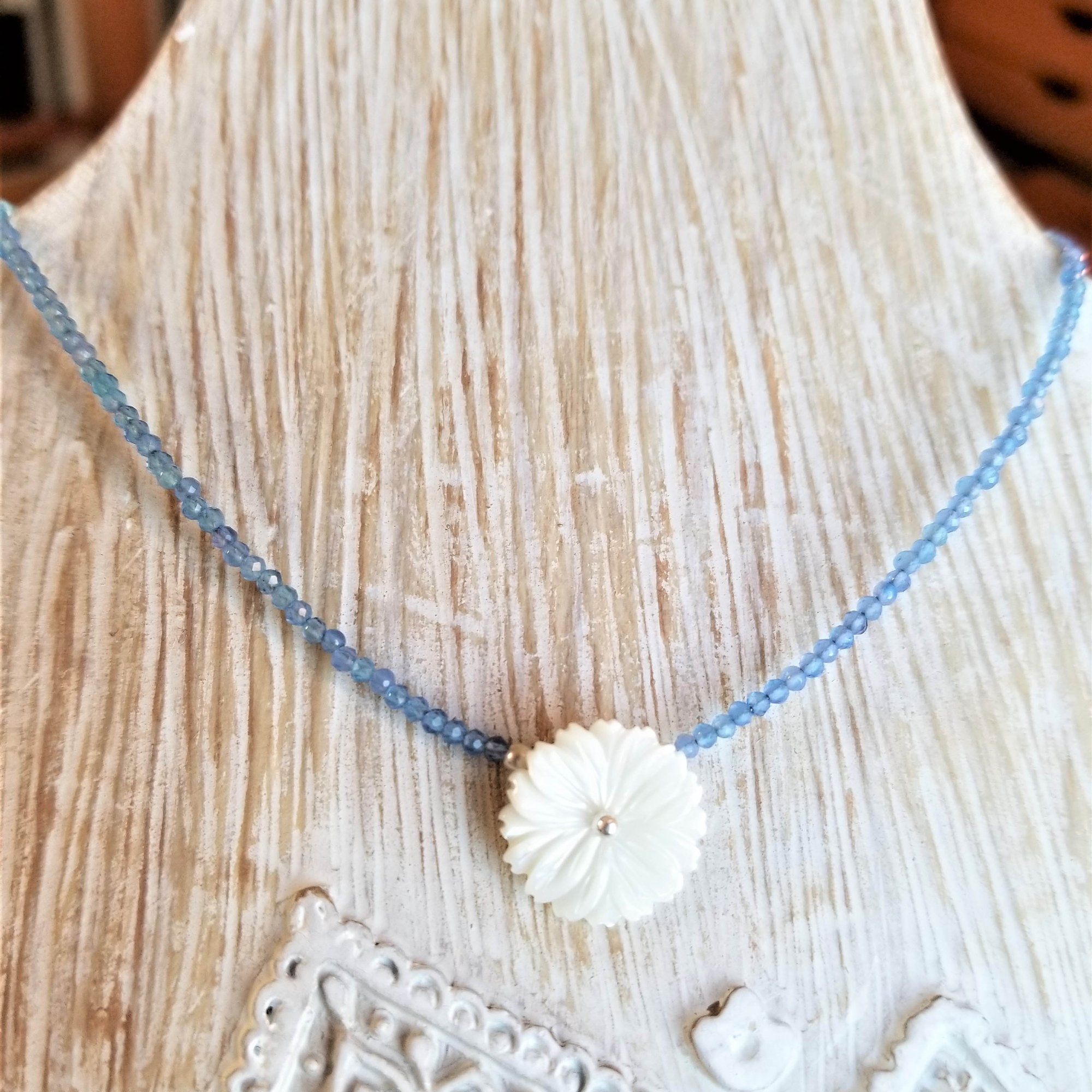 A lovely carved white mother of pearl chrysanthemum is nestled within a strand of itty bitty (2mm) faceted blue chalcedony beads. Lovely. Delicate. Feminine.