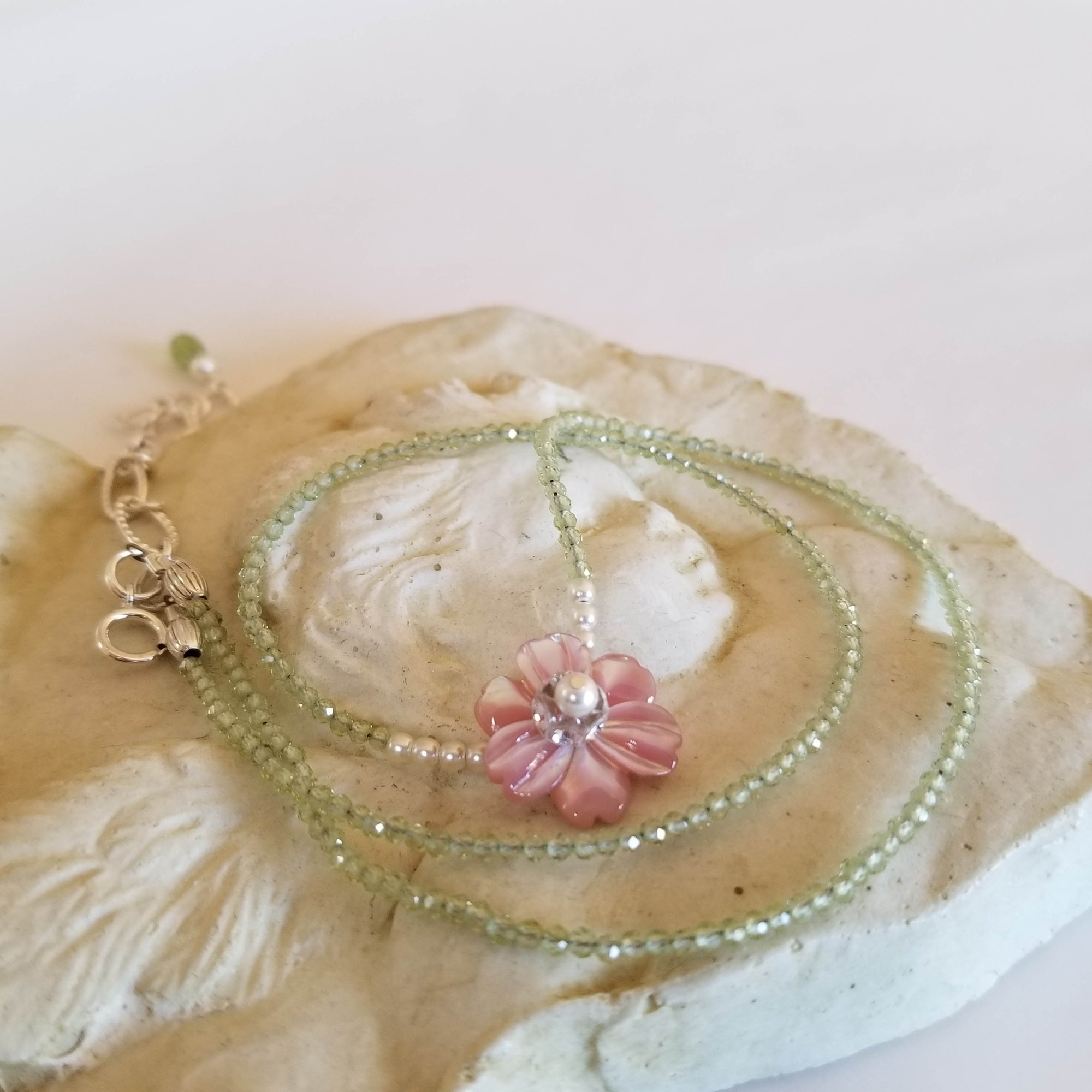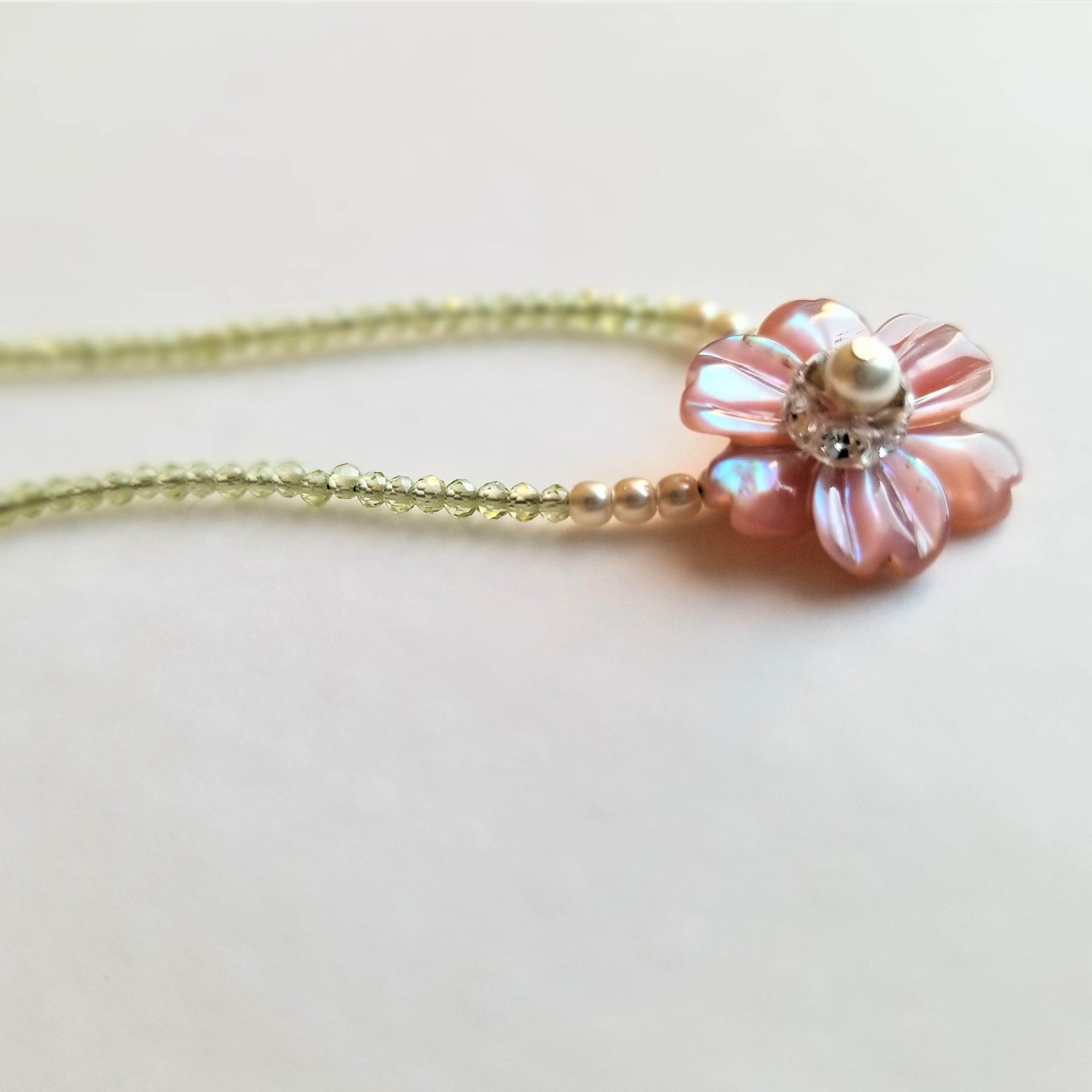 Sweet. Feminine. Pretty. A whisper of a necklace. Lovely carved pink mother of pearl flower is the beautiful feminine focal of this sweet necklace. Set off by tiny white Swarovski pearls and faceted green peridot beads. Super. Girlie. Sweet.