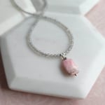 Simple. Sweet. Style. A soft pink rhodochrosite pendant hangs from a strand of small faceted soft gray labradorite beads. Necklace length is 16” – 17.5” (sterling extender chain). Pendant is just a tad under 1”. Finished with a sterling silver lobster clasp.