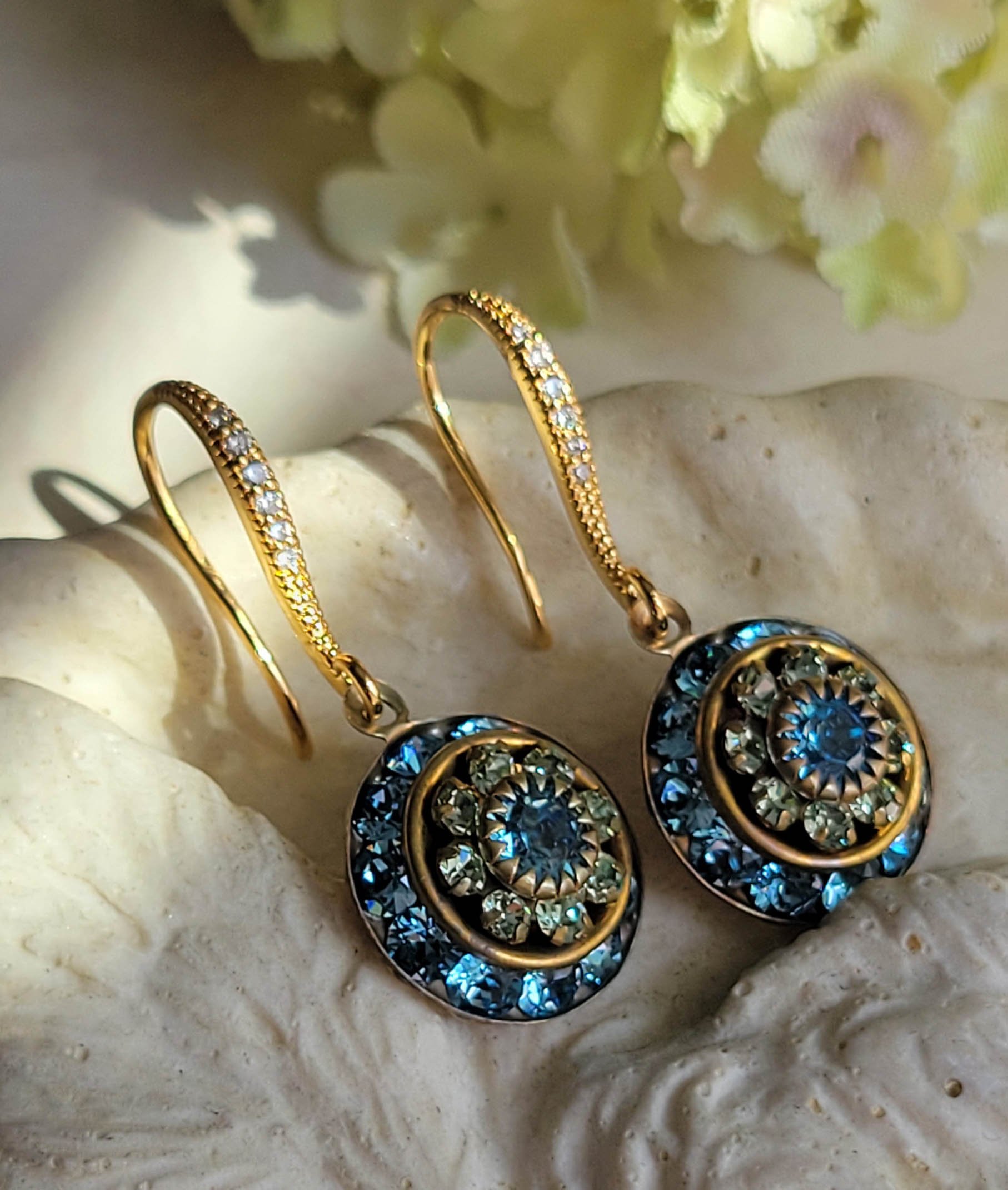 Lovely and hard-to-find, aqua and peridot layered Swarovski crystal drops hang from CZ encrusted ear wires. Elegant earrings that have gorgeous and fiery sparkle and beautiful soft colors.