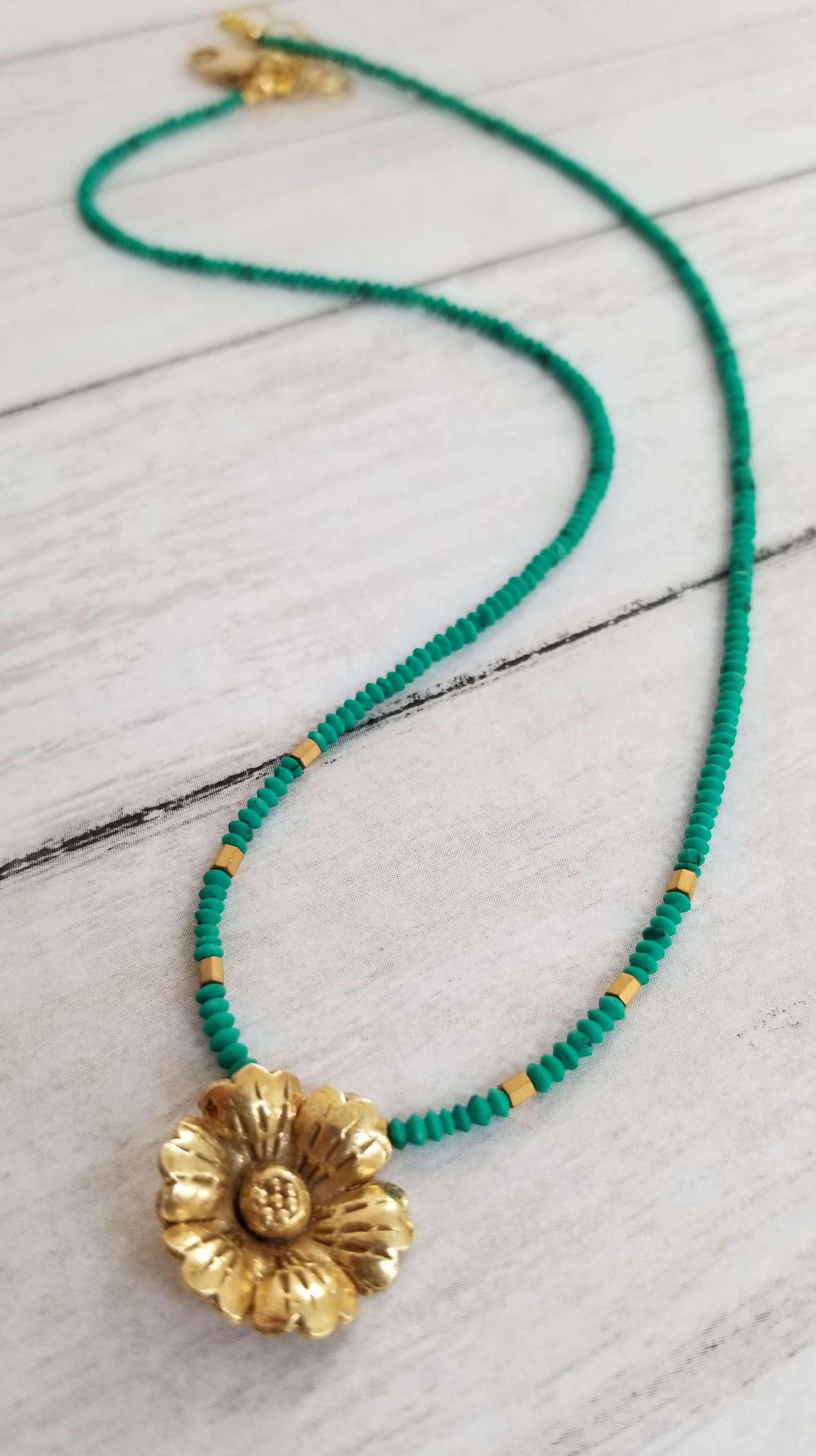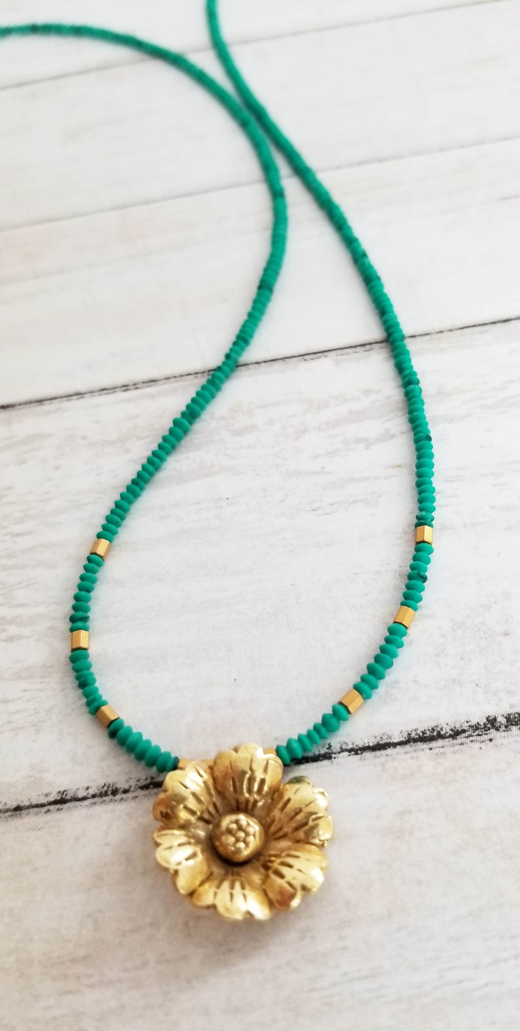 A beautifully detailed Thai made vermeil flower is the sweet focal of this lovely necklace. Hanging from a strand of hand-carved malachite beads dotted with tiny gold seed beads.