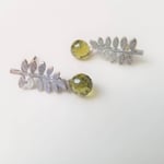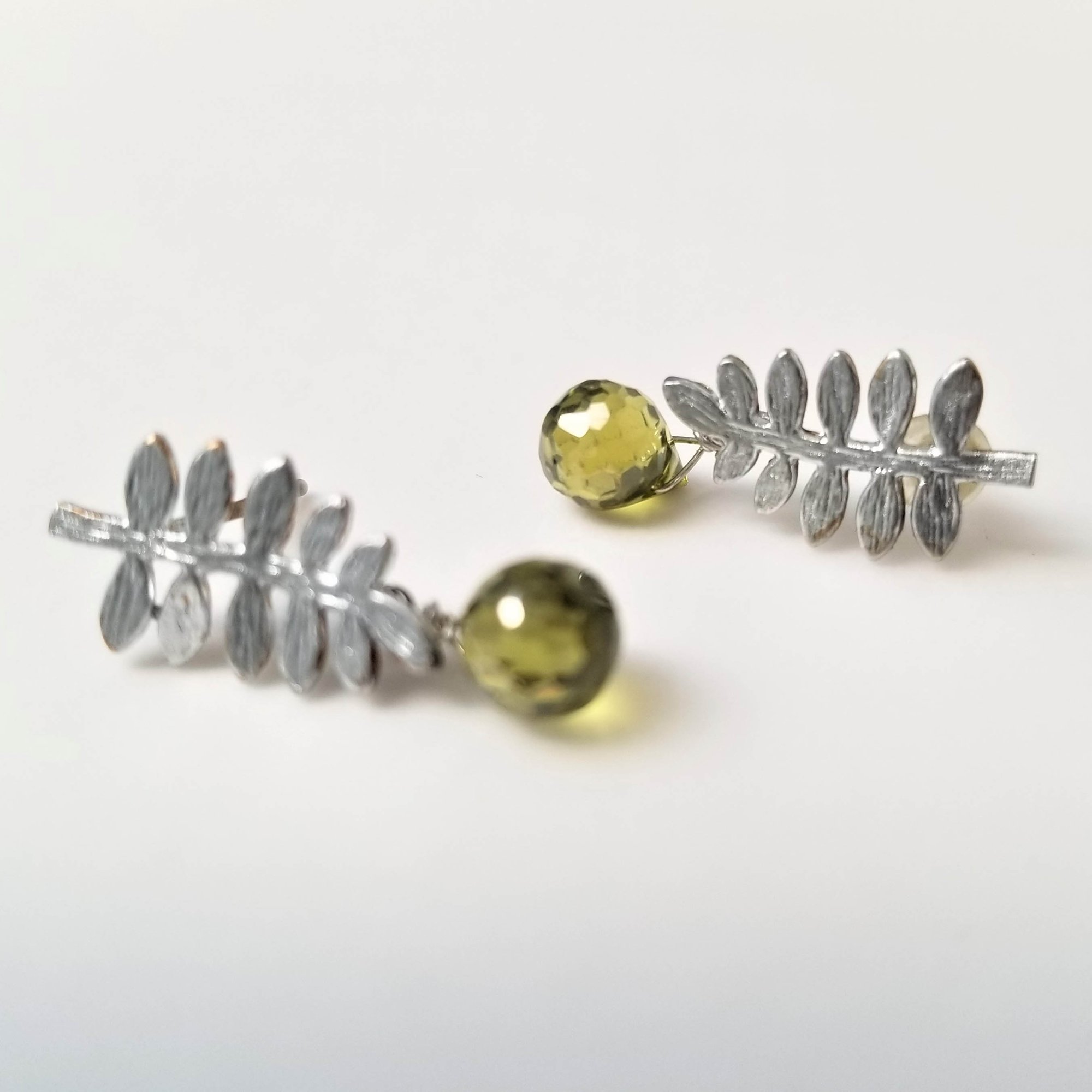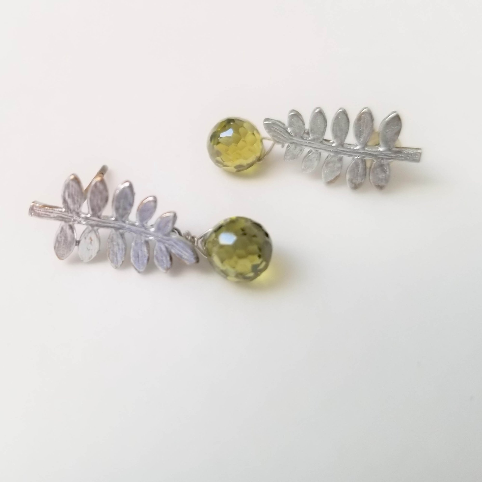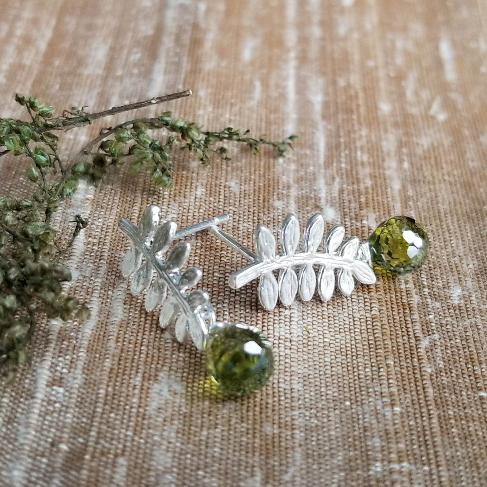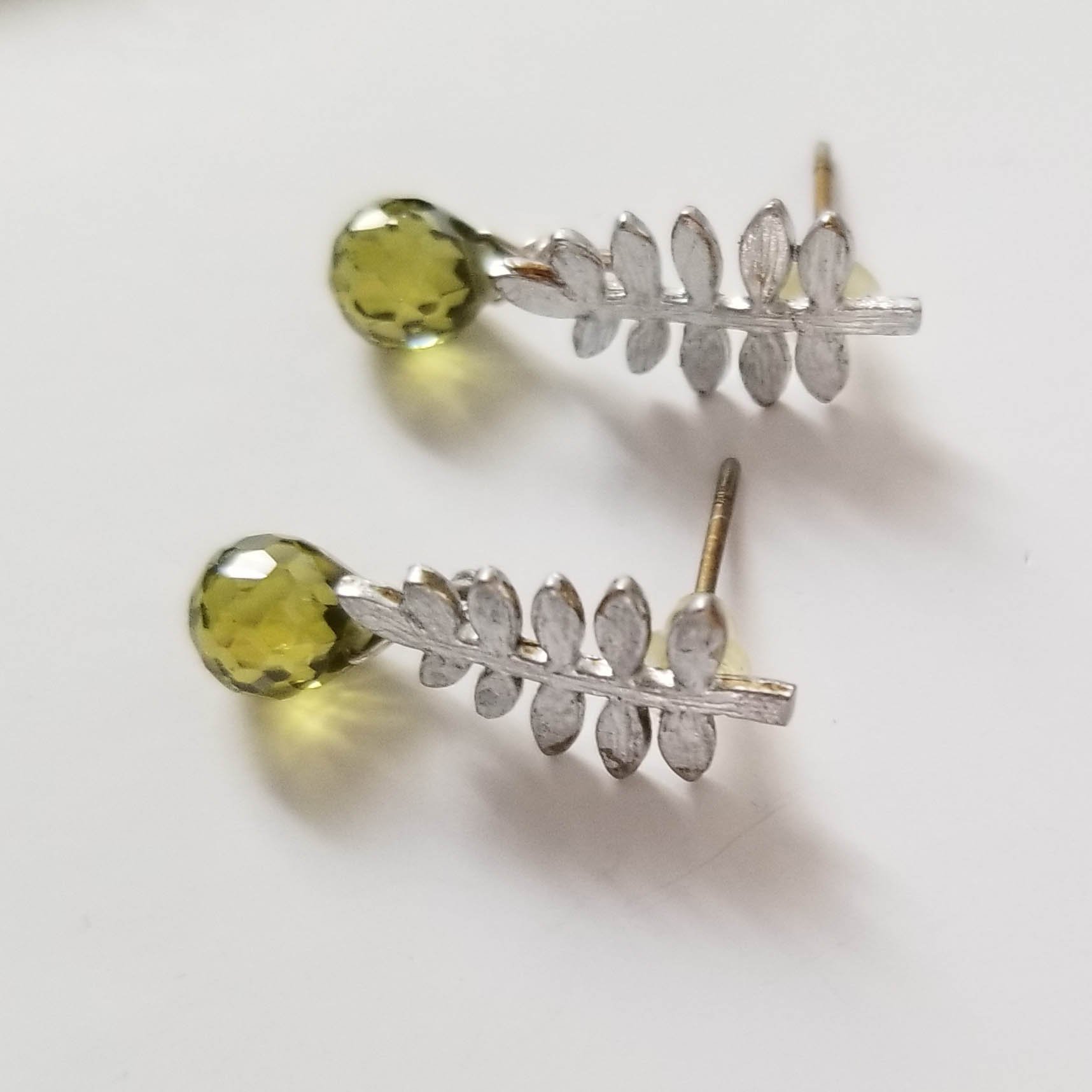A tiny faceted green CZ drop rolls off matte silver-plated brass fern frond. Stud earrings with rubber stopper backs. Simple beauty. Length is nearly 1”.