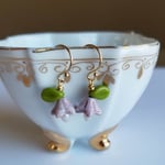 Tiny lilac Czech glass bell flowers and teardrop freshwater pearls are topped by green leaves. Hanging from ball ear wires. Available in silver and gold.