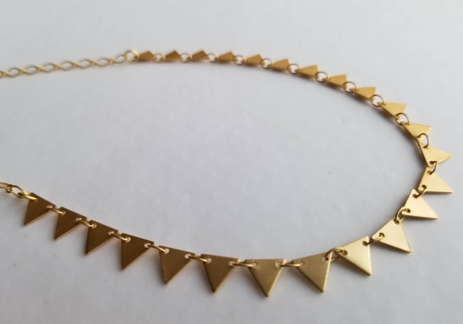 Tiny matte gold triangles. Finished with a simple matte gold oval diamond chain and a matte gold lobster clasp. (All components are electroplated, providing a very durable finish).
