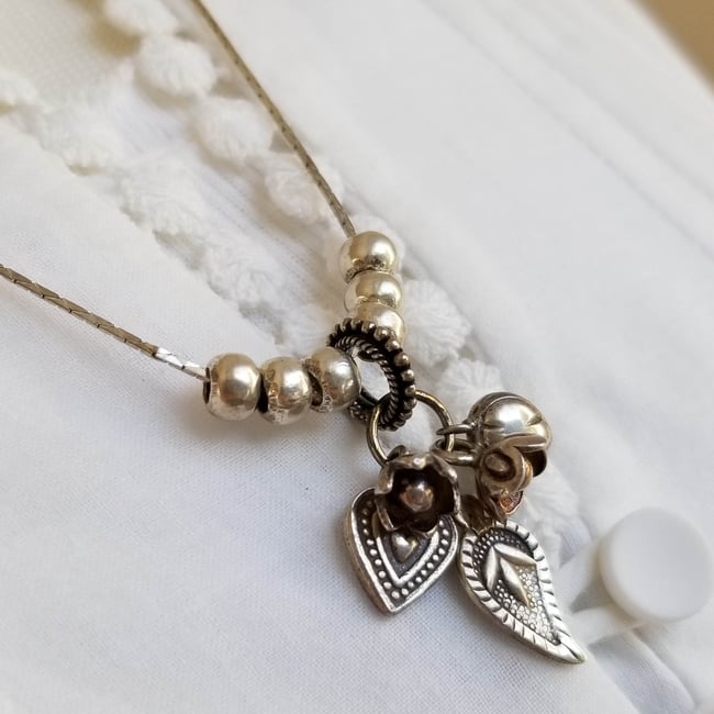 A sweet collection of Thai Hilltribe sterling silver charms: two tiny flowers, a heart, a leaf, and a teardrop dangle from a dotted rondelle. The charms and six small rondelle beads slide freely along a square sterling silver snake chain. A beautiful soft silver patina. Chain length is 24”; charms add an additional 1-1/2”.