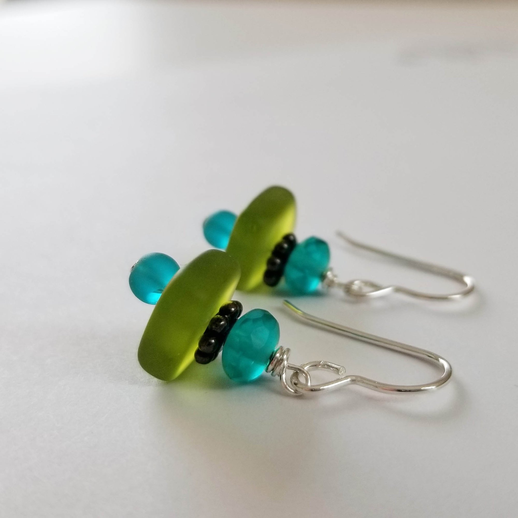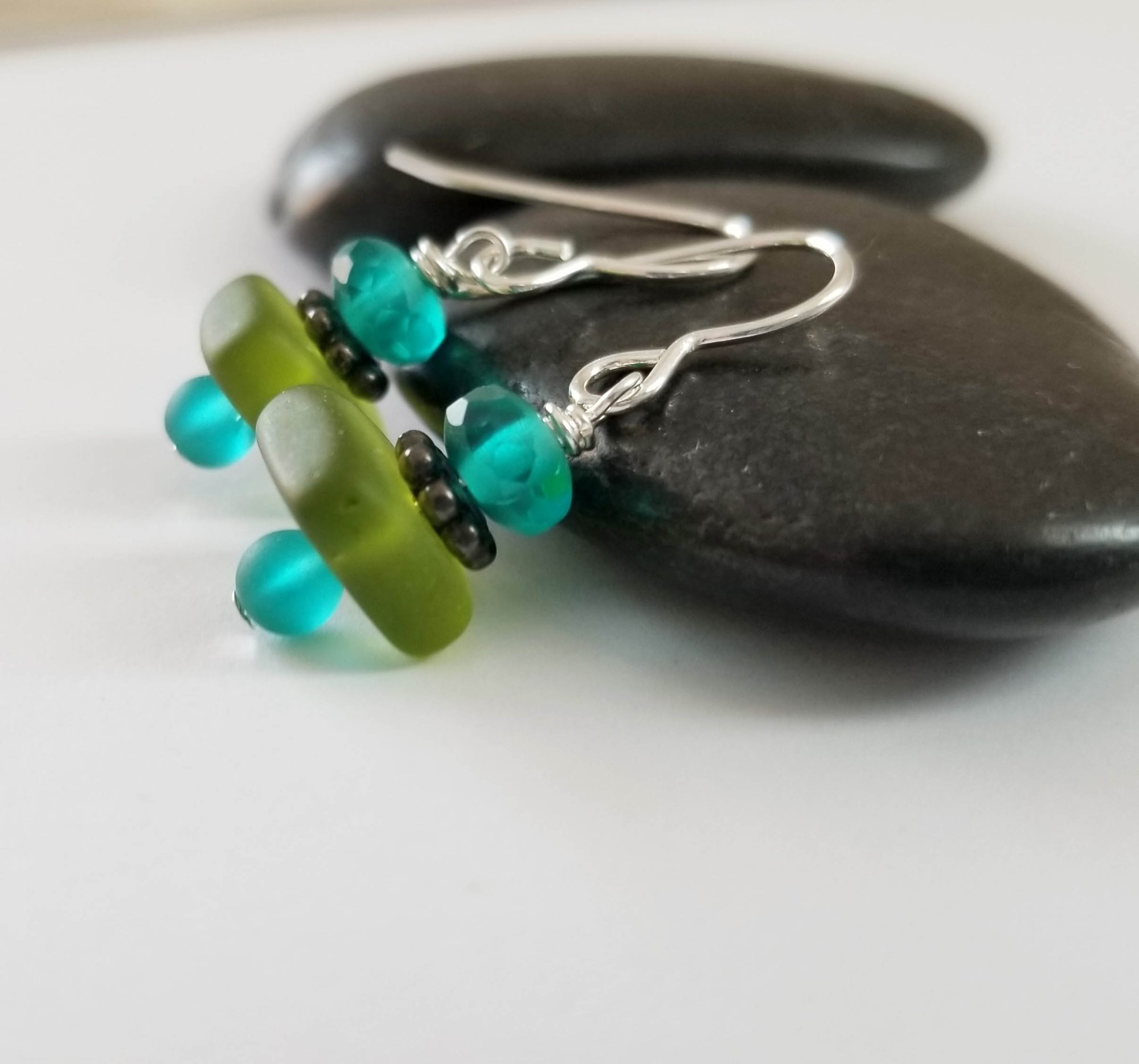 Breezy + tropical. Teal and dark green sea glass and crystal make for a colorful everyday earring. Sterling ear wires. These are a great casual earring.