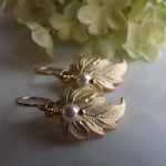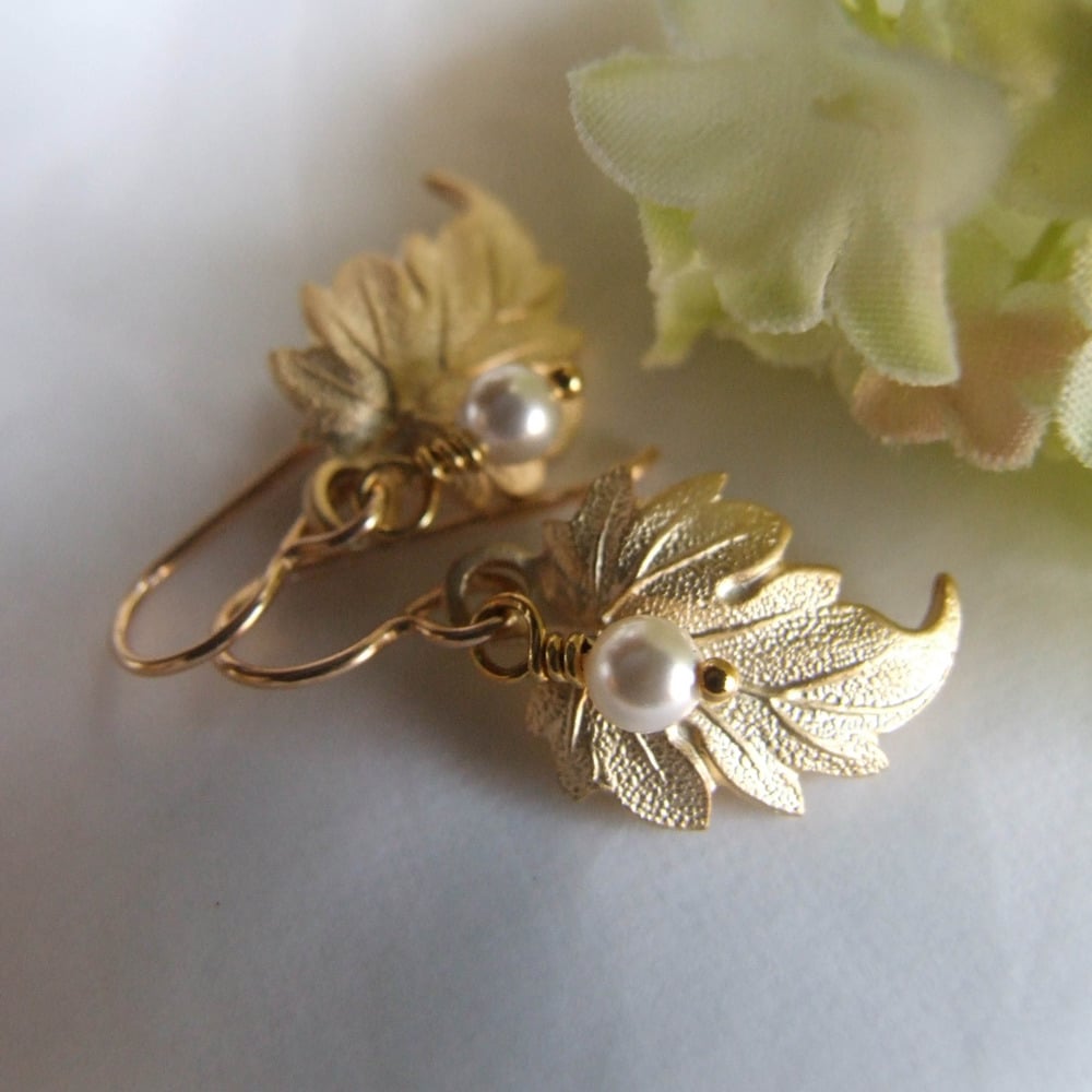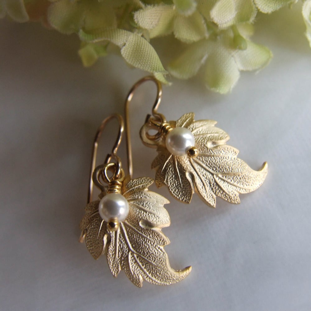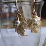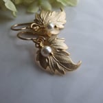 Windswept golden brass leaves simply embellished with a single white Swarovski crystal pearl. Hanging from gold-filled ear wires. Length is just over 1” from the top of the ear wire to the bottom of the leaf. Simple luxury.