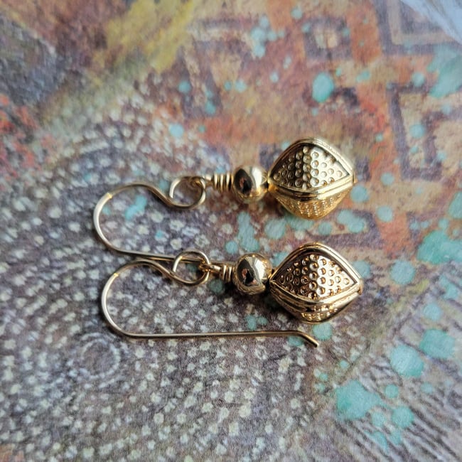 “Woven” brilliant gold bicone beads are topped by simple gold balls. Luxurious and lovely - simple everyday earrings. Hanging from gold filled ear wires.